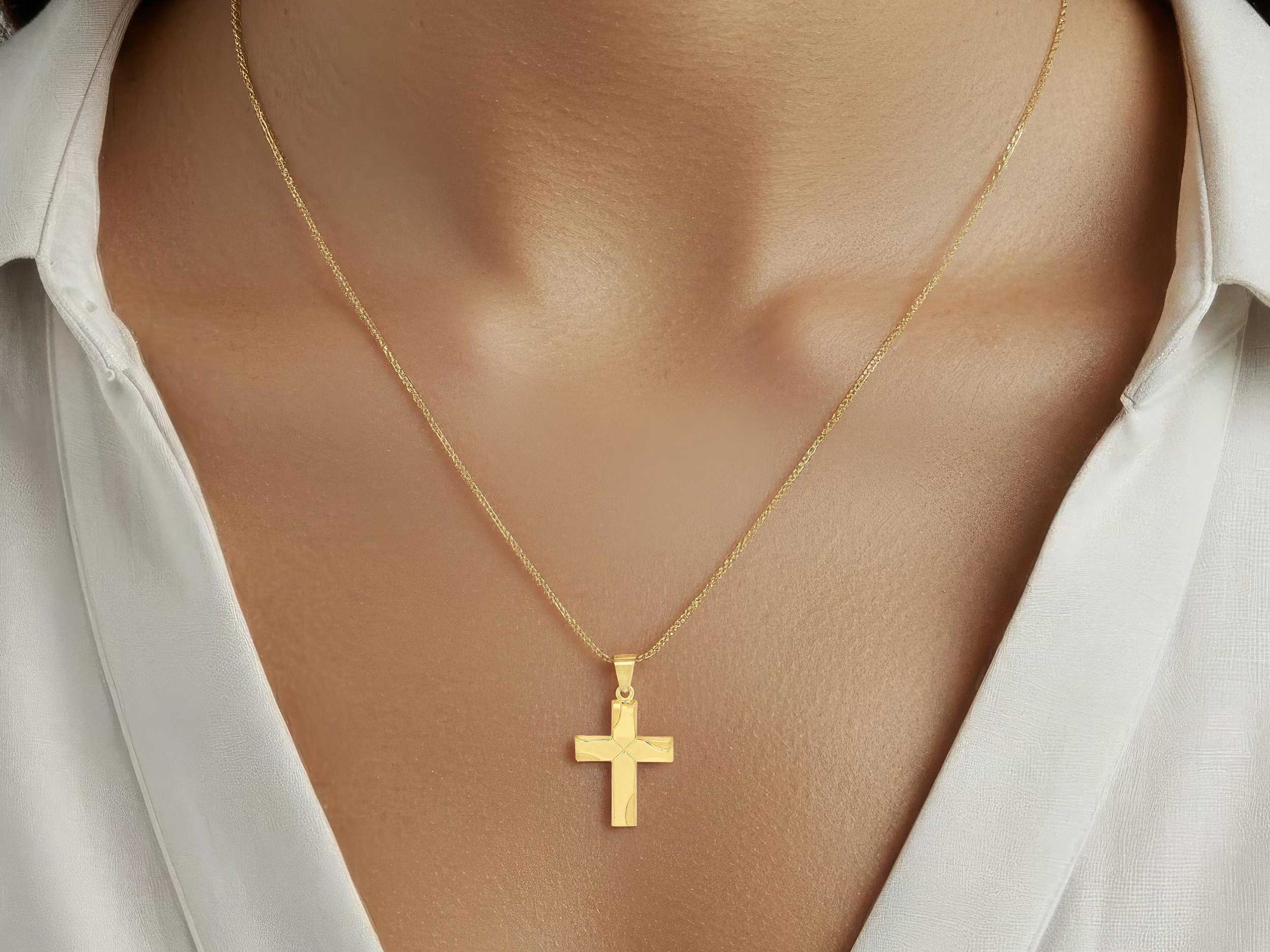 Σταυρός χρυσός 9Κ, με λουστρέ φινίρισμα και ματ λεπτομέρειες στις άκρες του. Η πίσω όψη του κοσμείται με ανάγλυφο σταυρό και το ΙΧΝΚ. Το συνολικό μήκος του με τον κρίκο είναι 2,80 cm. Συνδυάζεται άψογα με τις χρυσές αλυσίδες της συλλογής μας.