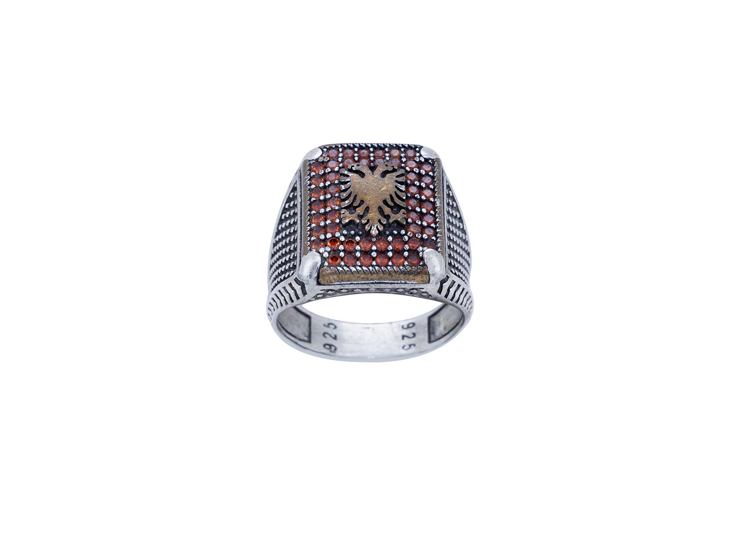 Ανδρικό σεβαλιέ δαχτυλίδι, σε ασήμι 925, με λουστρέ φινίρισμα. Κοσμείται με υπέροχες cubic ζιργκόν πέτρες σε πορτοκαλί χρώμα, επίχρυσα σχέδια και oxyde λεπτομέρειες.