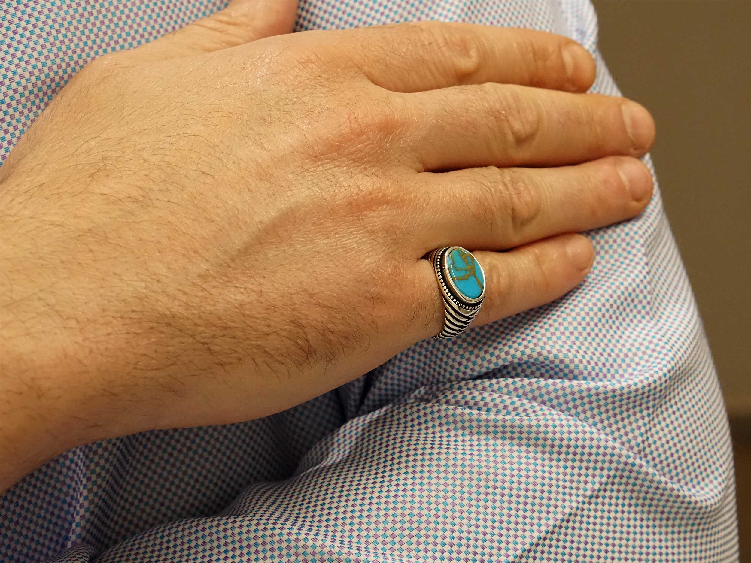 Ανδρικό δαχτυλίδι ασημένιο 925. Κοσμείται με μια εντυπωσιακή τιρκουάζ οβάλ πέτρα και με υπέροχα ανάγλυφα σχέδια με μαύρο oxyde. Μοναδικό δαχτυλίδι που θα αναβαθμίσει κάθε σας outfit!
