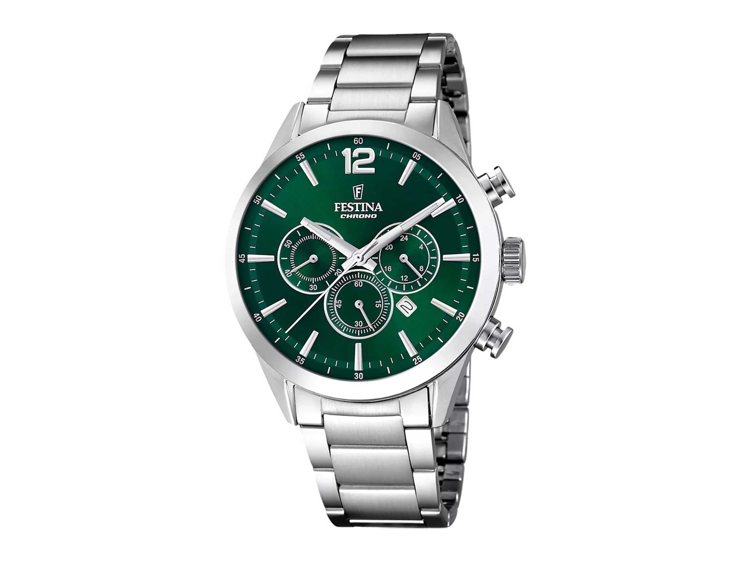 Ανδρικό ρολόι Festina (F20343/B), με πλαίσιο και μπρασελέ από ανοξείδωτο ατσάλι και κούμπωμα ασφαλείας. Το καντράν του έχει υπέροχο πράσινο χρώμα και διαθέτει ασημί δείκτες και χρονογράφο πολλαπλών λειτουργιών.