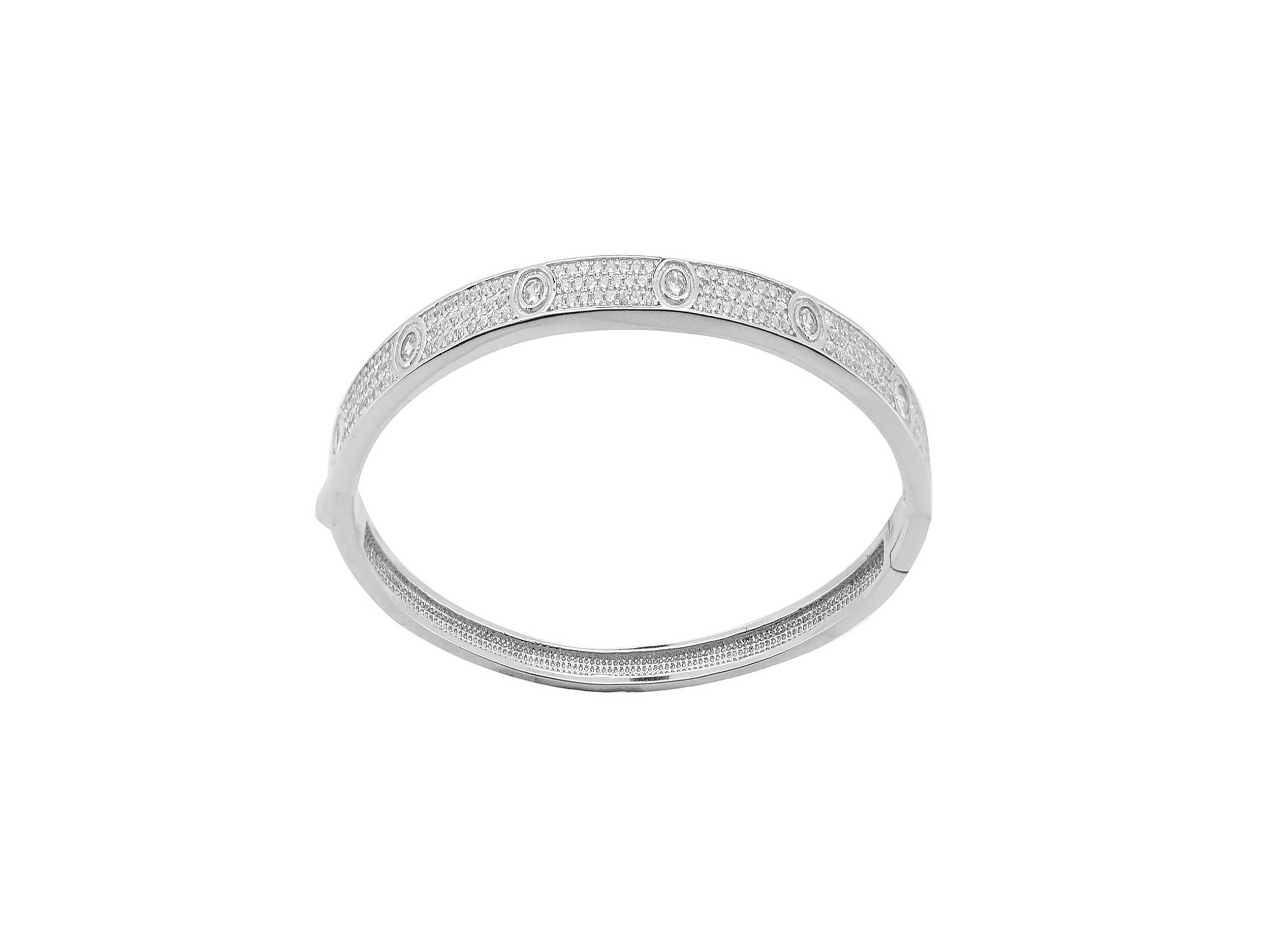 Ασημένια χειροπέδα γυναικεία 925. Μια εντυπωσιακή χειροπέδα, με λουστρέ φινίρισμα, διακοσμημένη στο επάνω μέρος με λευκές ζιργκόν πέτρες pavé και κυκλικά μοτίβα με ζιργκόν. Ιδανική για βραδινές εμφανίσεις ή για να προσθέσει λάμψη σε ένα minimal σύνολο.