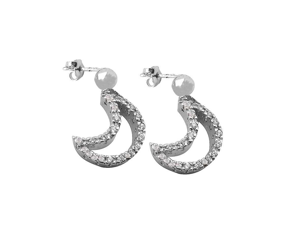 Ασημένια σκουλαρίκια μισοφέγγαρο 925, διακοσμημένα με λαμπερές, λευκές cubic ζιργκόν πέτρες. Το φινίρισμά του είναι λουστρέ και το χρώμα του μετάλλου του λευκό. Συνδυάστε τα με το ίδιο μενταγιόν και ολοκληρώστε το outfit σας.