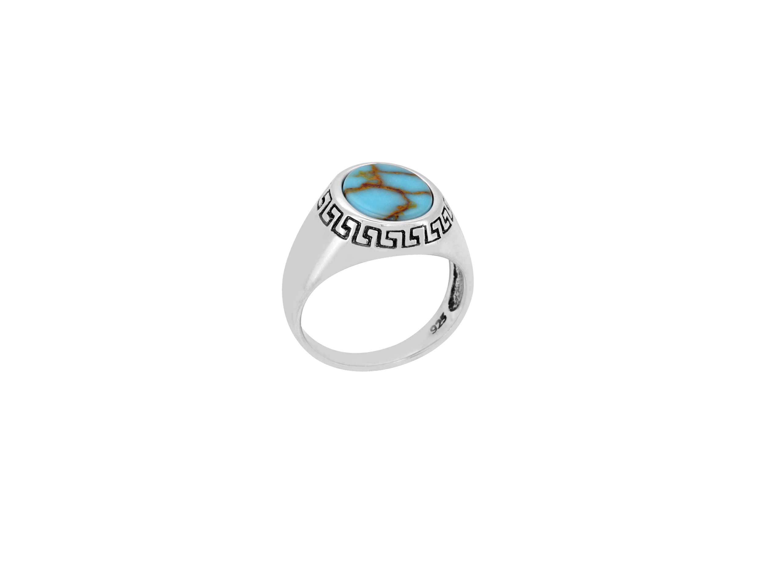 Ασημένιο ανδρικό δαχτυλίδι 925, διακοσμημένο με μια εντυπωσιακή τιρκουάζ πέτρα και με υπέροχους μαιάνδρους με μαύρο oxyde. Μοναδικό δαχτυλίδι που θα αναδείξει το στυλ σας!