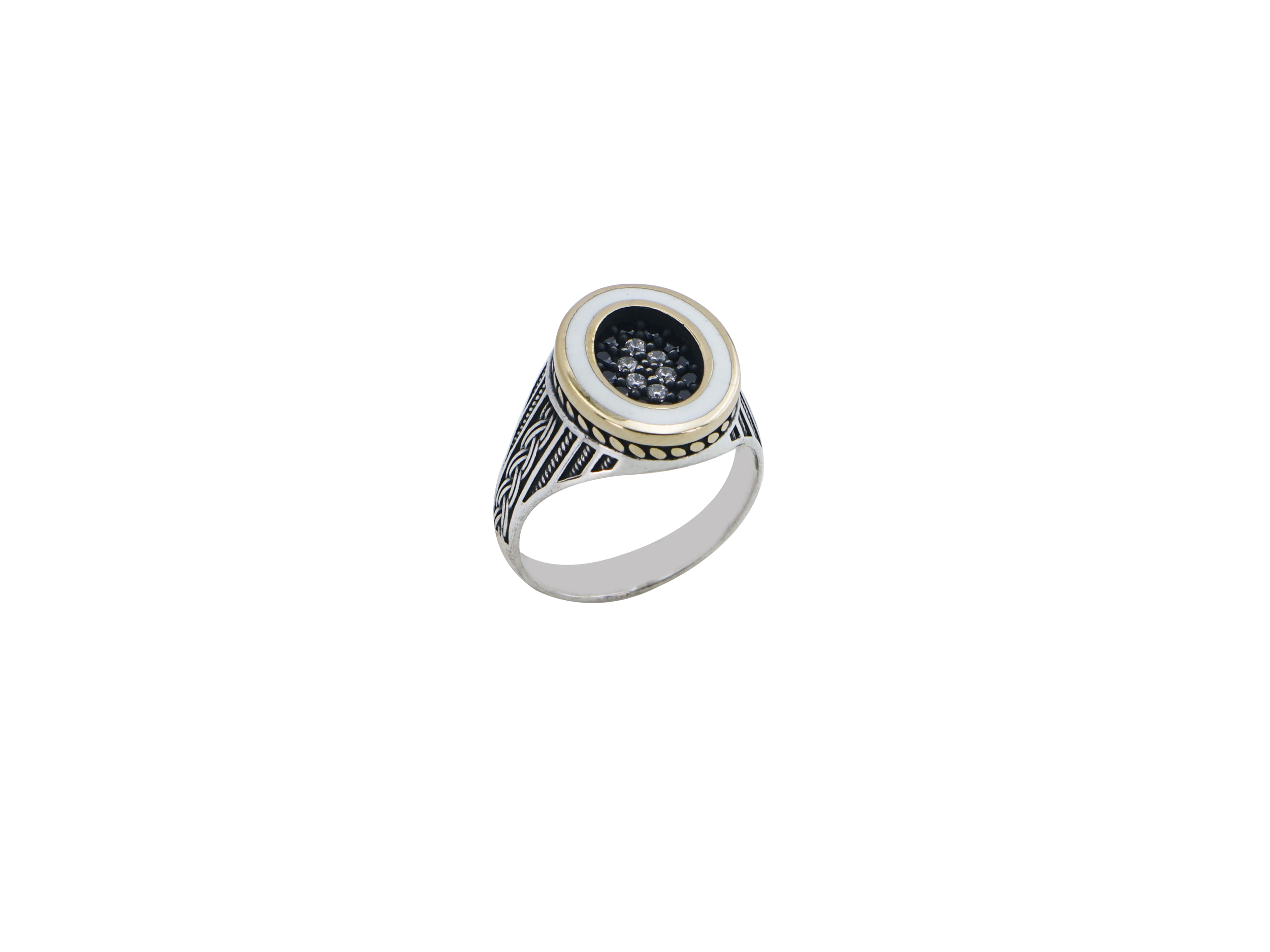 Ασημένιο δαχτυλίδι ανδρικό και γυναικείο 925. Έχει λευκό και κίτρινο χρώμα μετάλλου, με λεπτομέρειες από μαύρο oxyde. Κοσμείται με λευκό σμάλτο και υπέροχες cubic ζιργκόν πέτρες σε λευκό και μαύρο χρώμα. Ένα υπέροχο δαχτυλίδι, με unisex σχεδιασμό, που μπορεί να φορεθεί και ως σεβαλιέ!