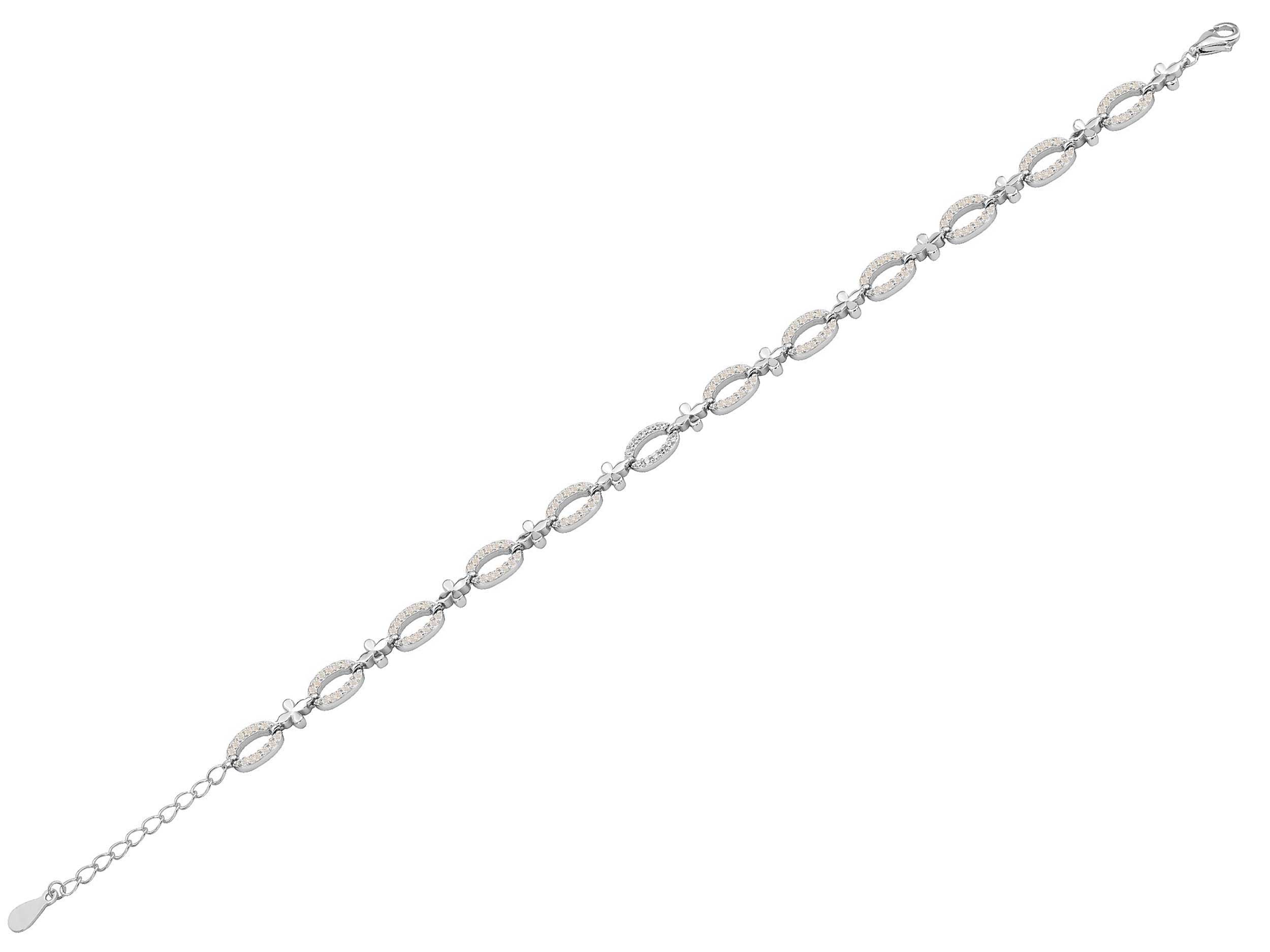 Ασημένιο γυναικείο βραχιόλι 925. Ένα κομψό βραχιόλι με ρομαντική διάθεση, που συνδυάζει διακριτικά οβάλ στοιχεία διακοσμημένα με λαμπερές cubic ζιργκόν πέτρες και μικρά μοτίφ σε σχήμα λουλουδιού. Το λουστρέ φινίρισμα και οι λευκές πέτρες ενισχύουν τη φωτεινότητα του κοσμήματος.