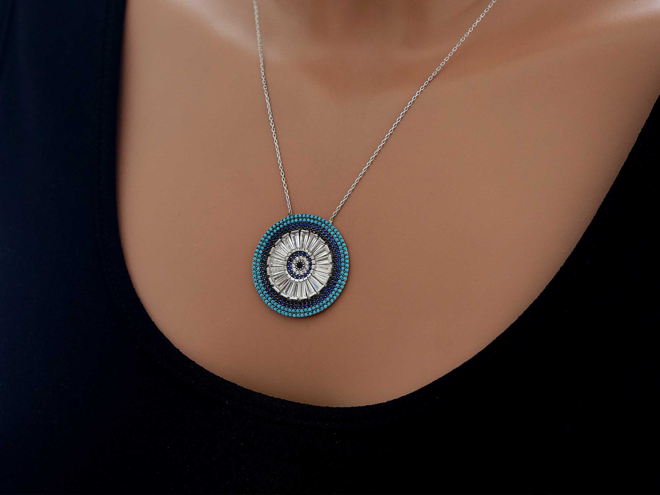 Ασημένιο κολιέ μάτι 925, διακοσμημένο με λαμπερές, cubic ζιργκόν πέτρες, σε τιρκουάζ, μπλε, μαύρο και λευκό χρώμα. Ένα εντυπωσιακό κολιέ, με υπέροχη λάμψη, για να συνδυάσετε με τα ανοιξιάτικα και καλοκαιρινά σας σύνολα!
