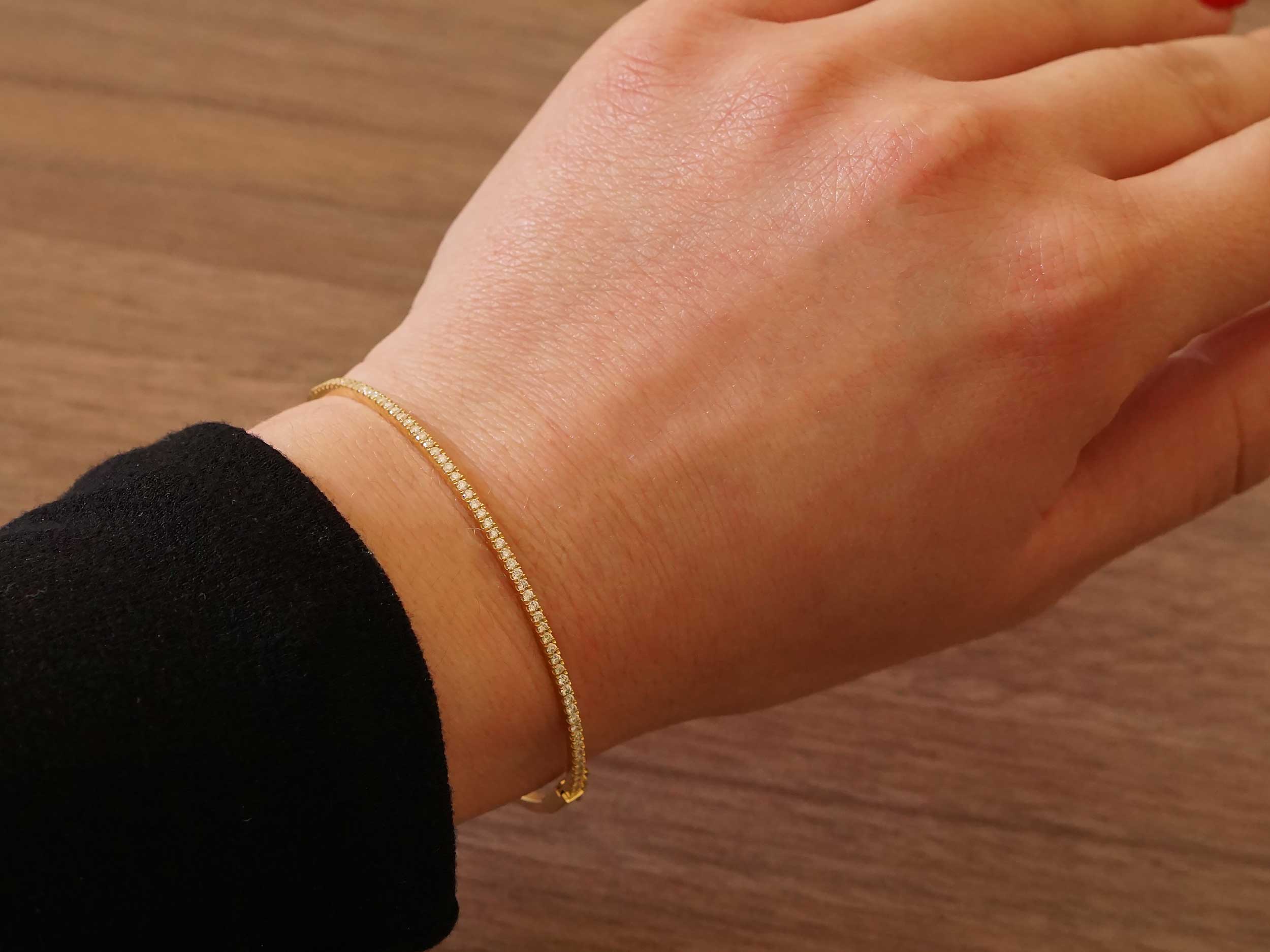 Βραχιόλι χειροπέδα με μπριγιάν, σε χρυσό 18 Καρατίων, πλάτους 0,20 cm. Έχει λουστρέ φινίρισμα και είναι διακοσμημένο με 58 διαμάντια κοπής round brilliant. Ένα minimal κόσμημα που θα προσθέσει την απαραίτητη δόση λάμψης που χρειάζεστε σε κάθε σας εμφάνιση!
