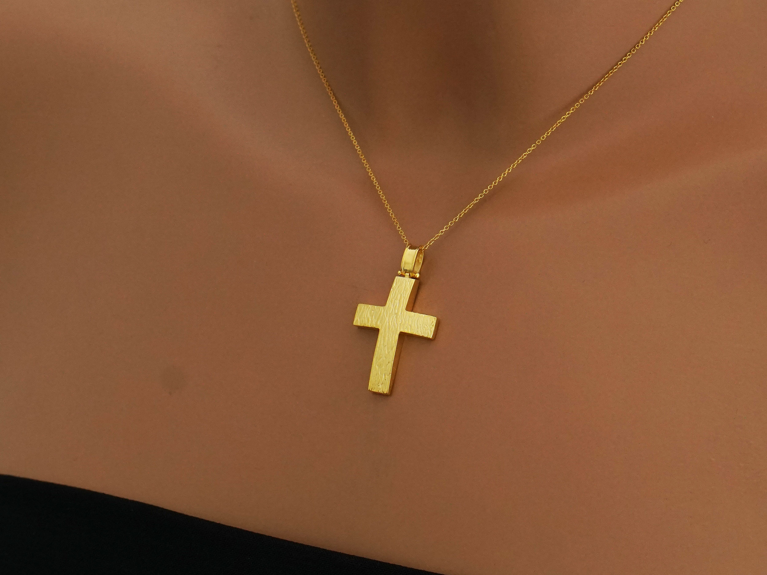 Χειροποίητος σταυρός βάπτισης και αρραβώνα, κατασκευασμένος από χρυσό 14 Καρατίων. Έχει ανάγλυφη ζαγρέ επιφάνεια στην μπροστινή όψη του με λουστρέ λεπτομέρειες και υπέροχη καμπυλωτή σχεδίαση. Το συνολικό μήκος του είναι 3,10 cm. Συνδυάζεται άψογα με τις χρυσές αλυσίδες 14Κ της συλλογής μας.