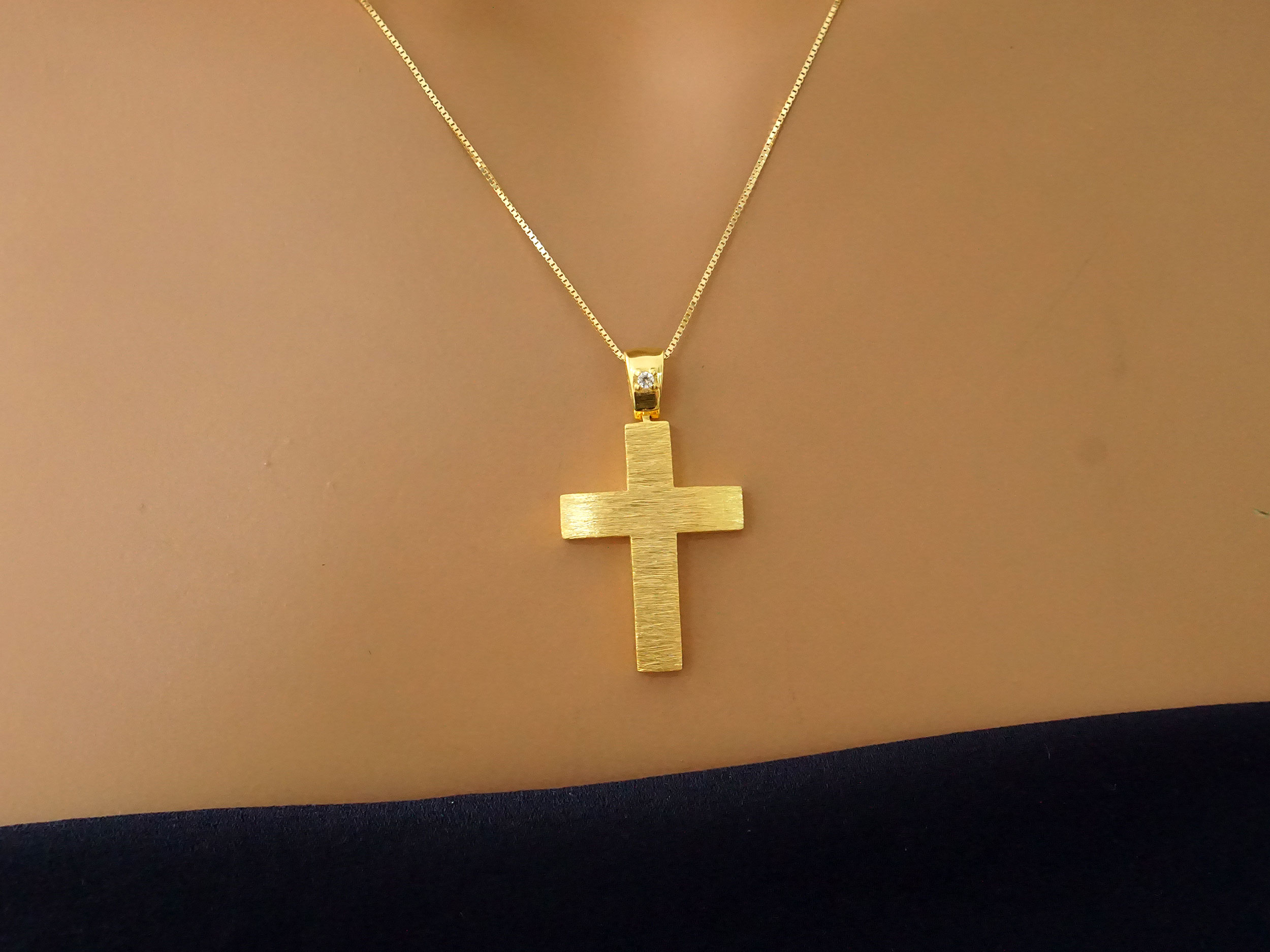 Χειροποίητος σταυρός με ζιργκόν σε χρυσό 14 Καρατίων. Το φινίρισμά του είναι ζαγρέ στην μπροστινή όψη και λουστρέ στην πίσω. Το συνολικό μήκος του με τον κρίκο είναι 3,70 cm. Κοσμείται με cubic ζιργκόν πέτρες λευκού χρώματος στο κρικάκι. Κομψός γυναικείος σταυρός για βάπτιση και γάμο υψηλής αισθητικής και ποιότητας. Συνδυάσετε τον με μία χρυσή αλυσίδα από τη συλλογή μας.