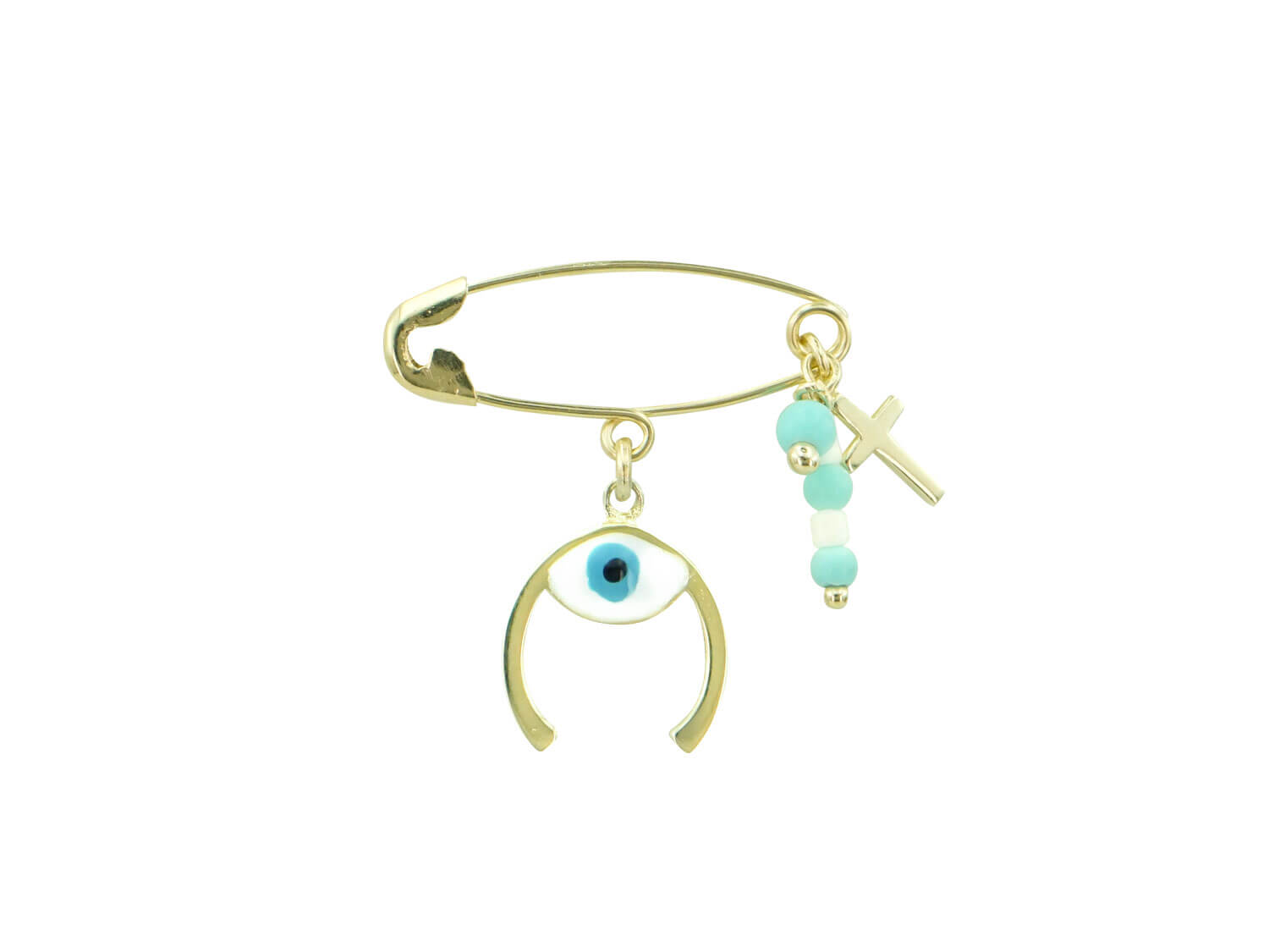 Πανέμορφη χρυσή παραμάνα με ματάκι και σταυρουδάκι 9 Καρατίων. Το χρώμα του μετάλλου της είναι κίτρινο χρυσό και το φινίρισμά της λουστρέ. Το ματάκι είναι κατασκευασμένο από λευκό και γαλάζιο σμάλτο. Διακοσμείται με πέτρες σε λευκό και γαλάζιο χρώμα. Υπέροχο δώρο για νεογέννητο αγοράκι!