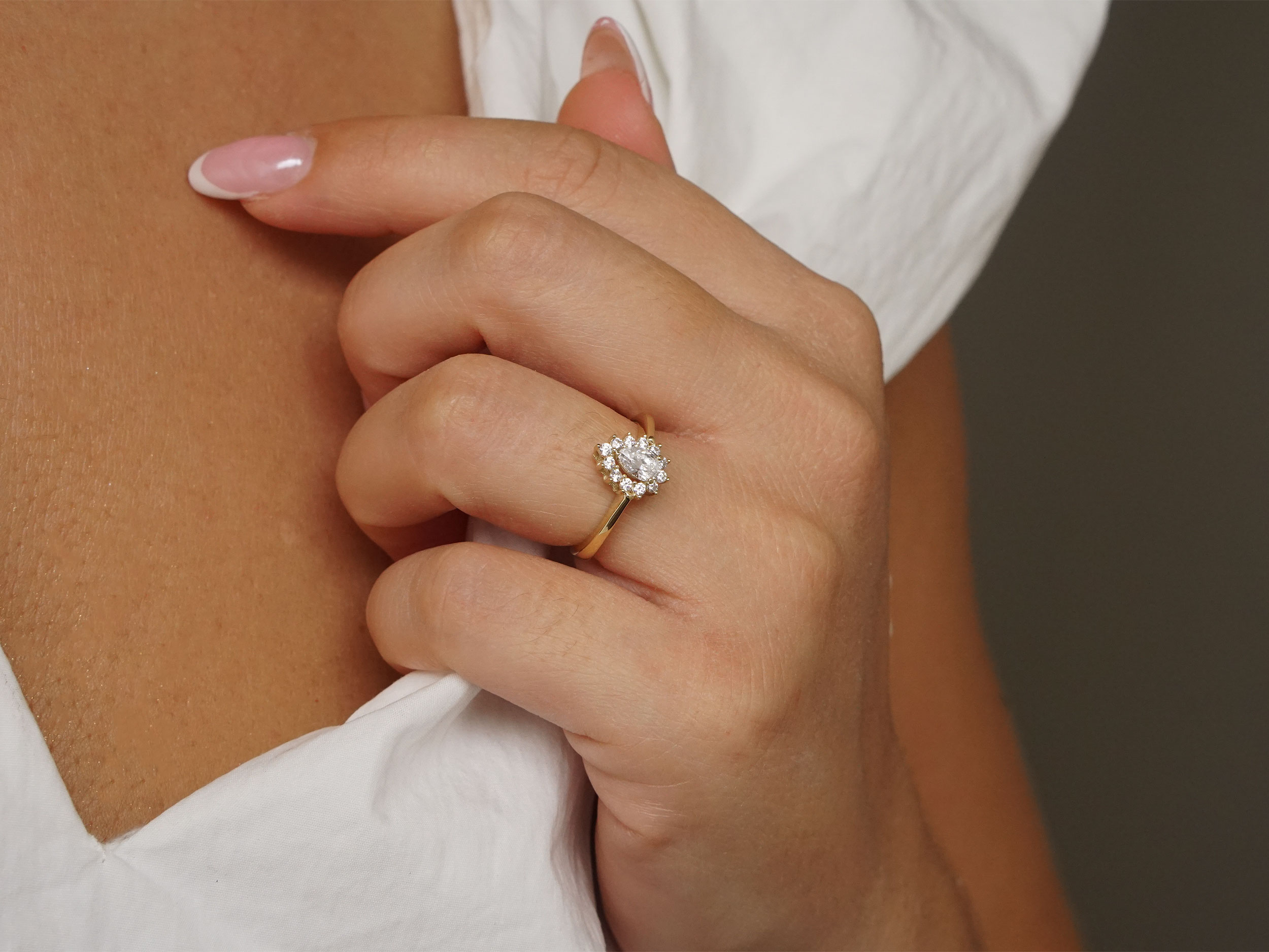 Μια λαμπερή χρυσή ροζέτα 9 Καρατίων, σε σχήμα δάκρυ, διακοσμημένη με λευκές cubic ζιργκόν πέτρες. Ένα δαχτυλίδι που προσθέτει κομψότητα και μια αίσθηση πολυτέλειας σε κάθε εμφάνιση.