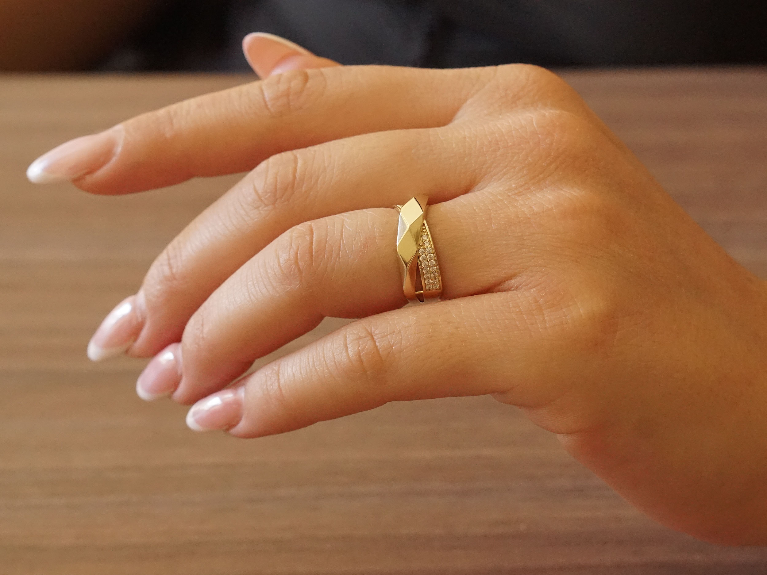 Χρυσό δαχτυλίδι χιαστί 9 Καρατίων, με λουστρέ φινίρισμα. Η ιδιαίτερη σχεδίασή του και οι λευκές cubic ζιργκόν πέτρες παβέ που το κοσμούν, δημιουργούν ένα κομψό και εντυπωσιακό αποτέλεσμα.