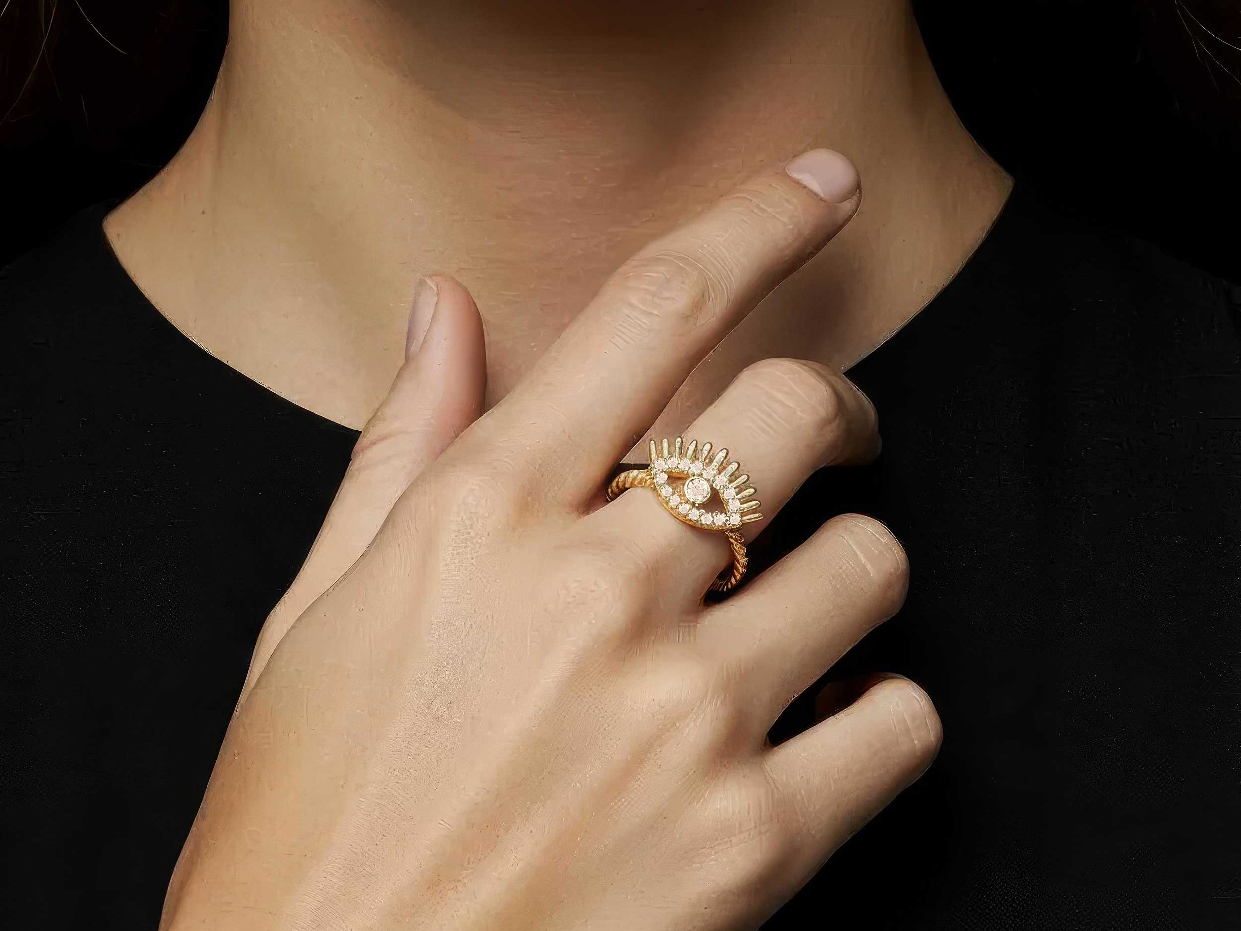 Χρυσό δαχτυλίδι ματάκι 14 Καρατίων, με λουστρέ φινίρισμα. Κοσμείται με λαμπερές cubic ζιργκόν πέτρες σε λευκό χρώμα και έχει υπέροχη, λουστρέ, στριφτή γάμπα. Με το κομψό και σύγχρονο στυλ του, αποτελεί ιδανική επιλογή για κάθε περίσταση,