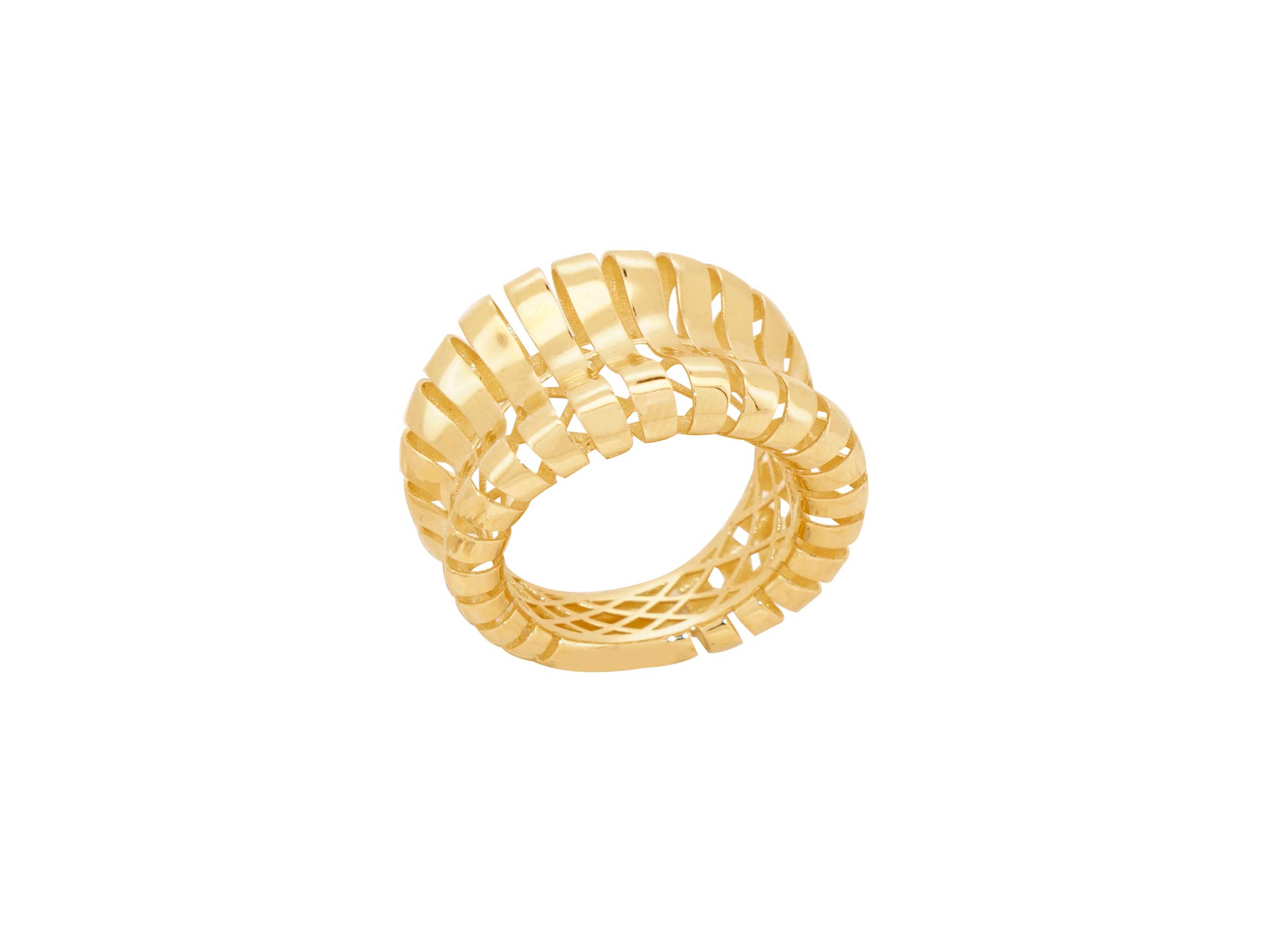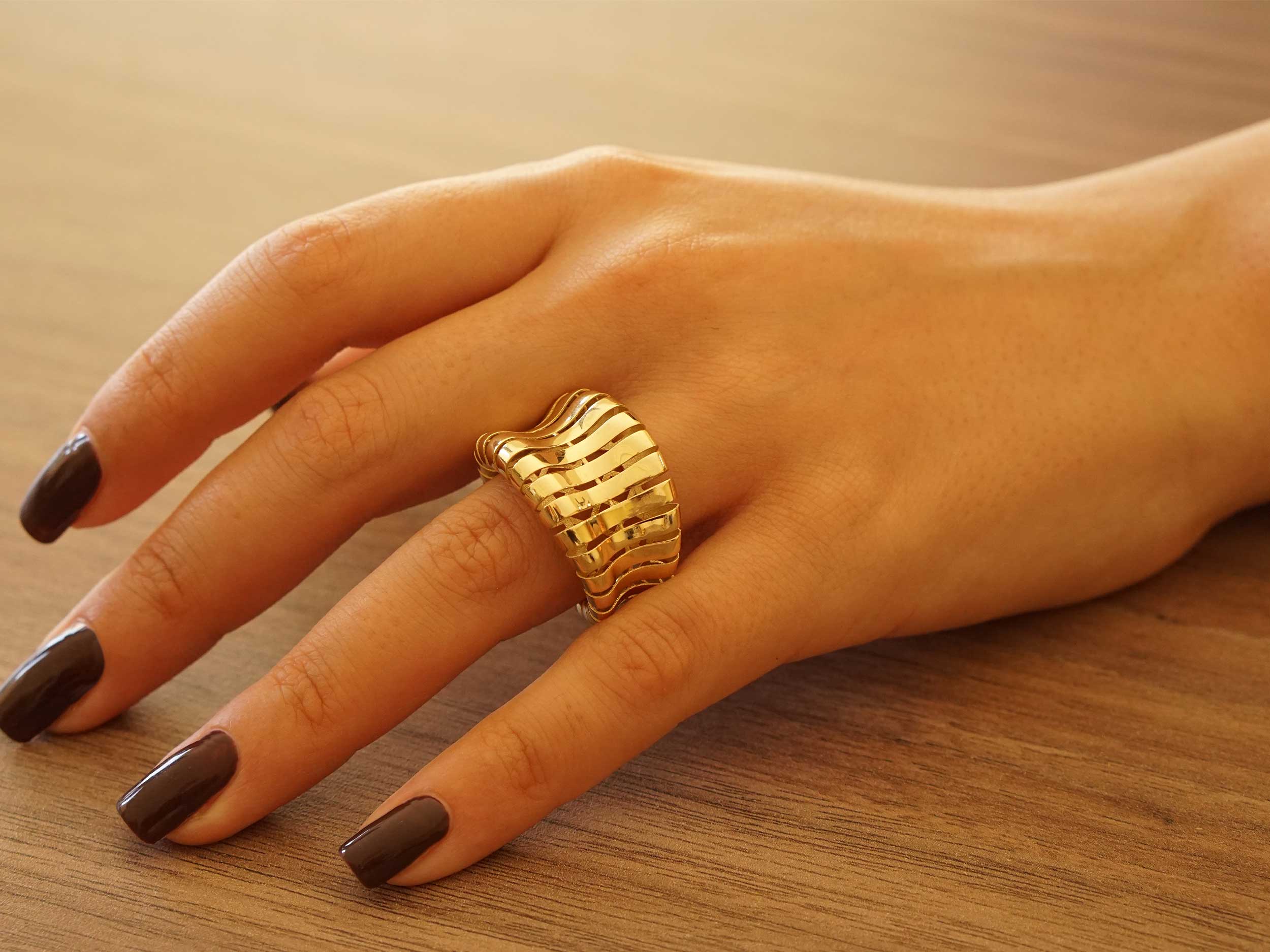 Δαχτυλίδι με ραβδώσεις, κατασκευασμένο από χρυσό 14 Καρατίων, με λουστρέ φινίρισμα. Το κόσμημα έχει έναν μοναδικό statement όγκο. Φορέστε το μόνο του ή συνδυάστε το με άλλα δαχτυλίδια για ένα εντυπωσιακό layering.