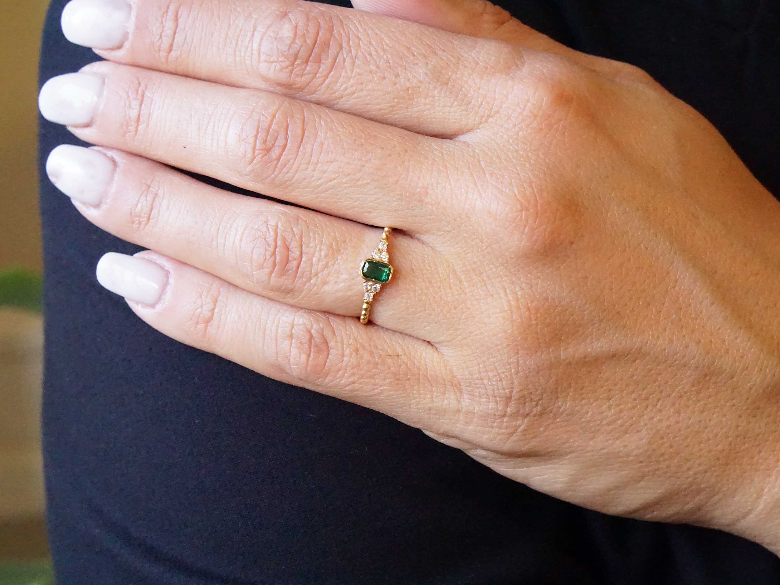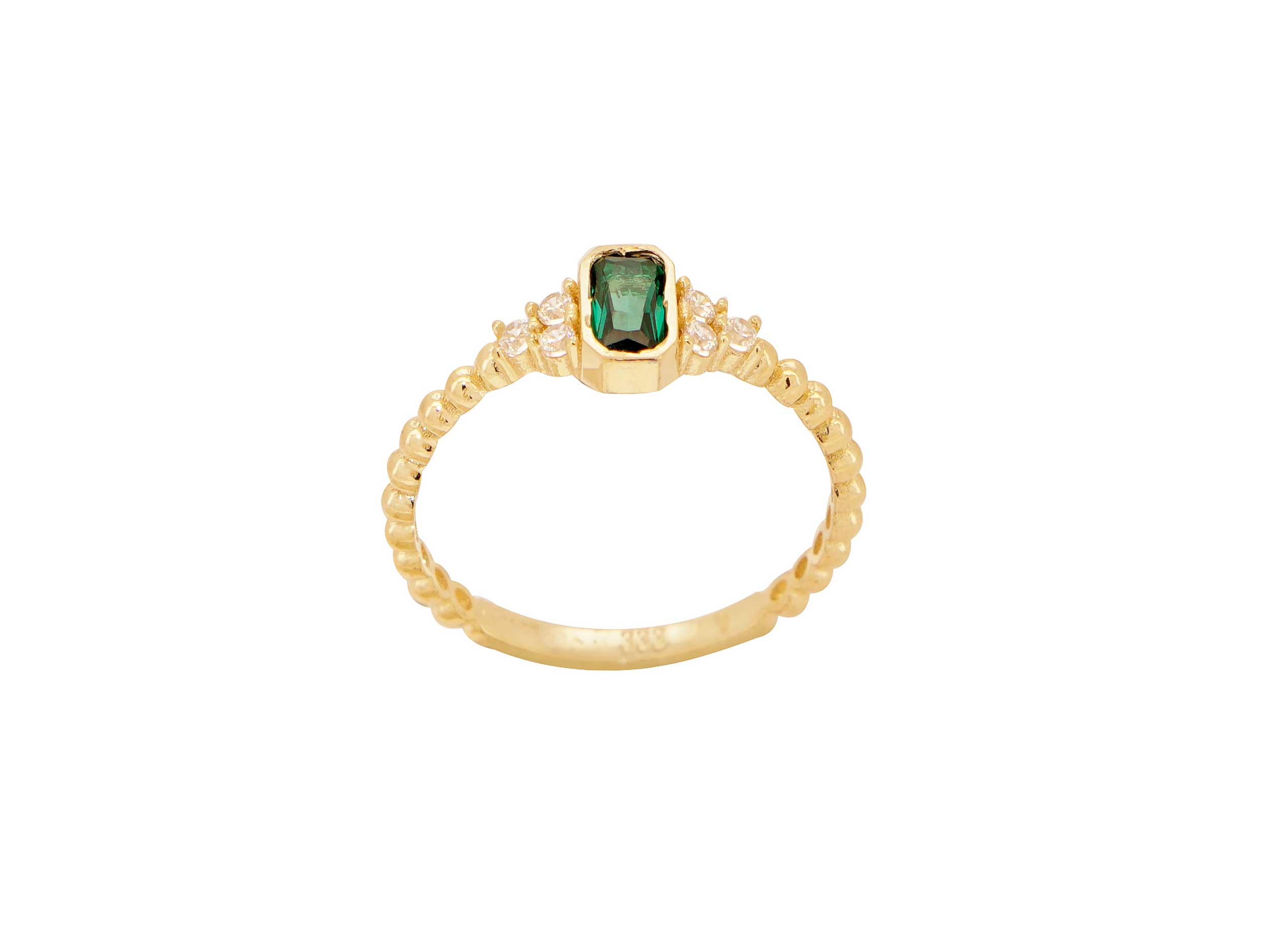 Χρυσό δαχτυλίδι με πράσινη πέτρα στο κέντρο και έξι μικρότερες, λευκές cubic ζιργκόν πέτρες. Είναι κατασκευασμένο από χρυσό 8 Καρατίων και έχει υπέροχη λουστρέ, ανάγλυφη γάμπα. Ένα κόσμημα που θα προσθέσει μια χρωματιστή και λαμπερή πινελιά σε κάθε σας εμφάνιση.