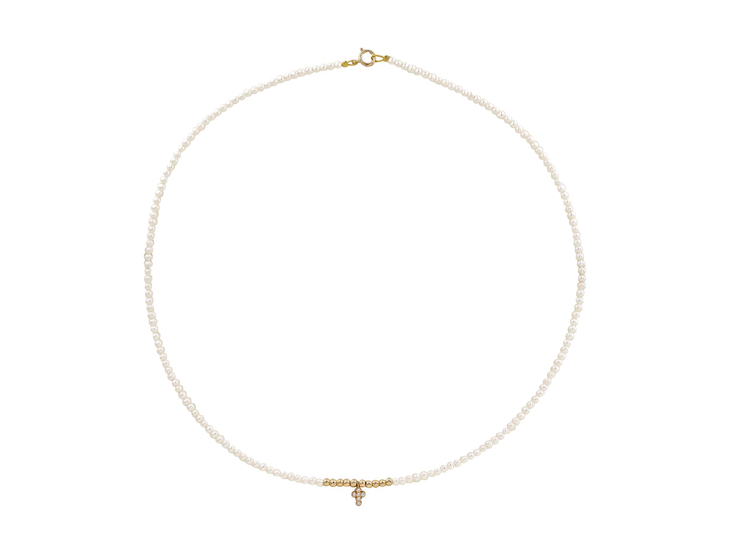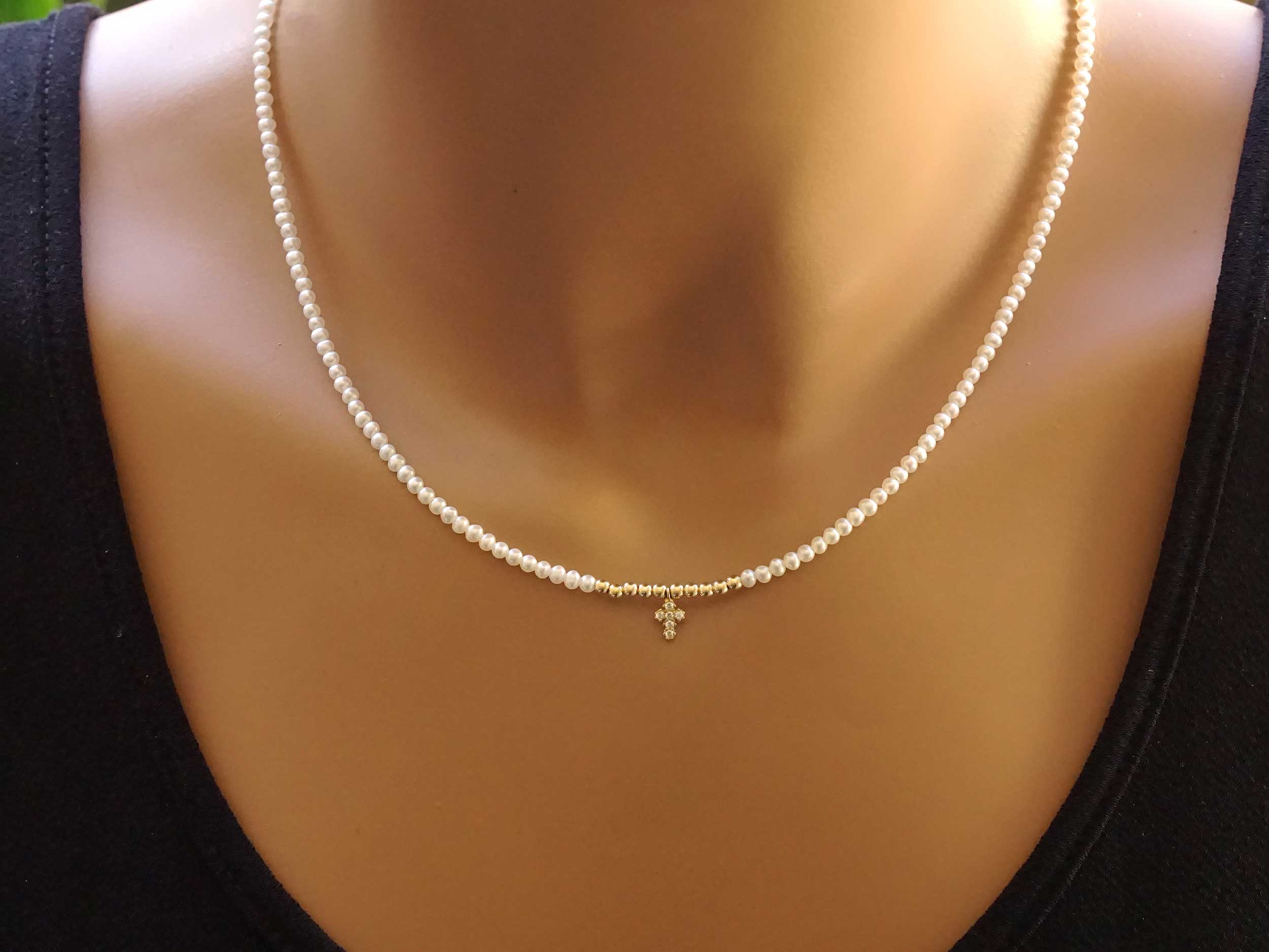Minimal χρυσό 14 Καρατίων κολιέ με μαργαριτάρια fresh water σε λευκό χρώμα. Κοσμείται με ένα κρεμαστό διακριτικό σταυρουδάκι με λευκές cubic zircon πέτρες και με 10 λαμπερές μπίλιες σε κίτρινο χρώμα. Η διάμετρος των μαργαριταριών είναι 2,50 – 3,00 mm και έχουν σχήμα round. Ένα εντυπωσιακό κόσμημα που θα λατρέψετε!