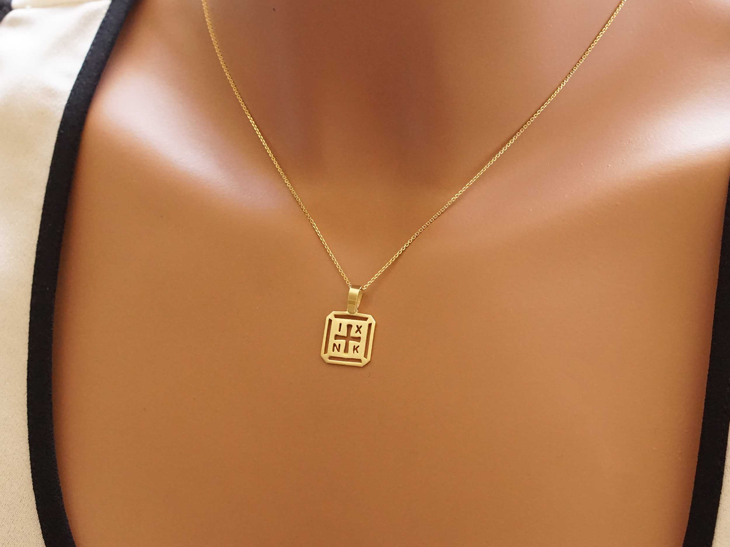 Χρυσό Κωνσταντινάτο 14Κ, με λουστρέ φινίρισμα. Κοσμείται με διάτρητο σταυρό και το ΙΧΝΚ. Το συνολικό μήκος του με τον κρίκο είναι 1,80 cm. Μπορεί να φορεθεί με μια χρυσή αλυσίδα 14Κ .