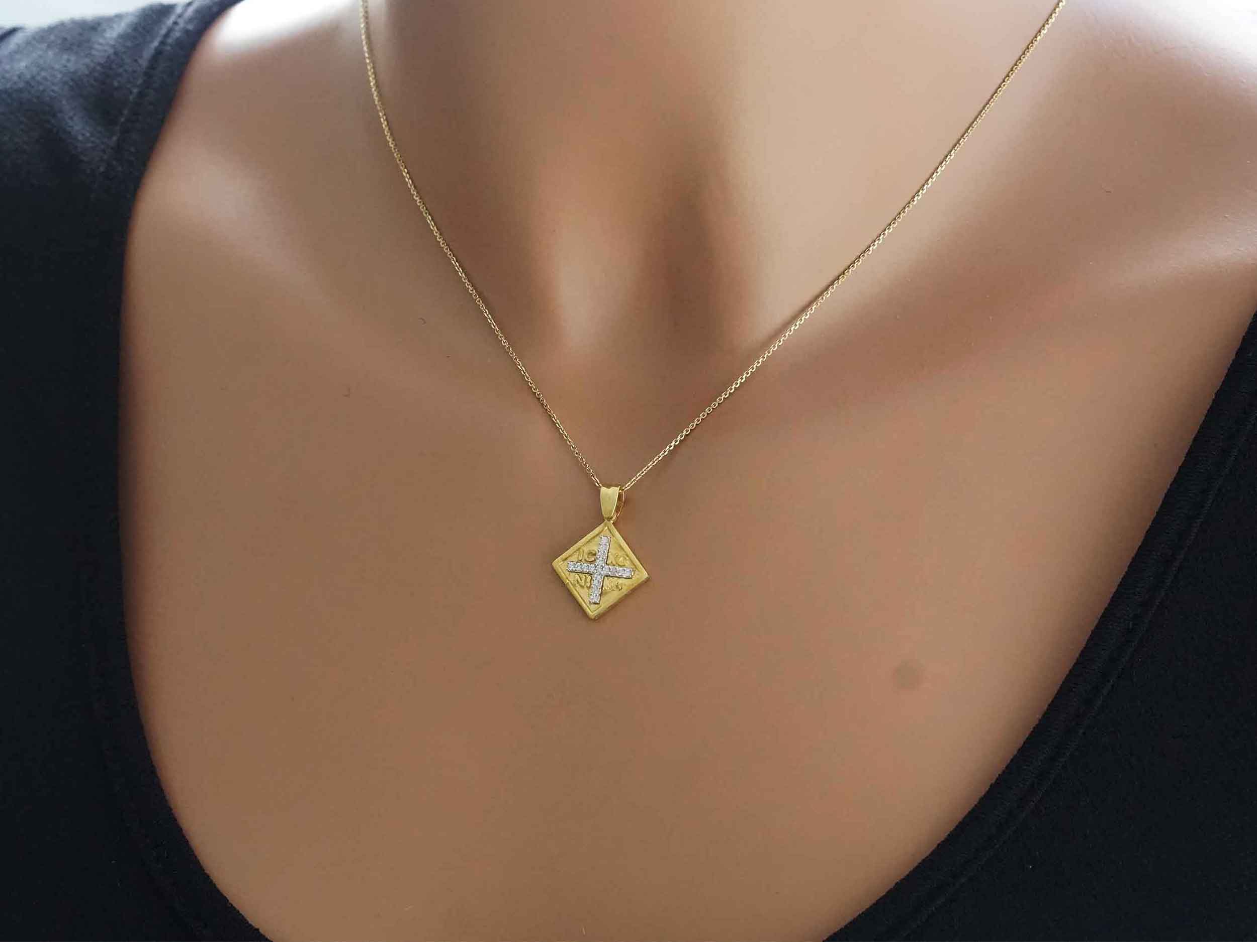 Κωνσταντινάτο με ζιργκόν πέτρες, σε χρυσό 14 Καρατίων. Η μία όψη του κοσμείται με ανάγλυφο ΙΧΝΚ και λευκές cubic ζιργκόν πέτρες και η άλλη όψη του απεικονίζει τους Αγίους Κωνσταντίνο και Ελένη. Το συνολικό μήκος του είναι 1,90 cm. Μπορείτε να το συνδυάσετε με παραμάνα ή με μια χρυσή αλυσίδα 14Κ .