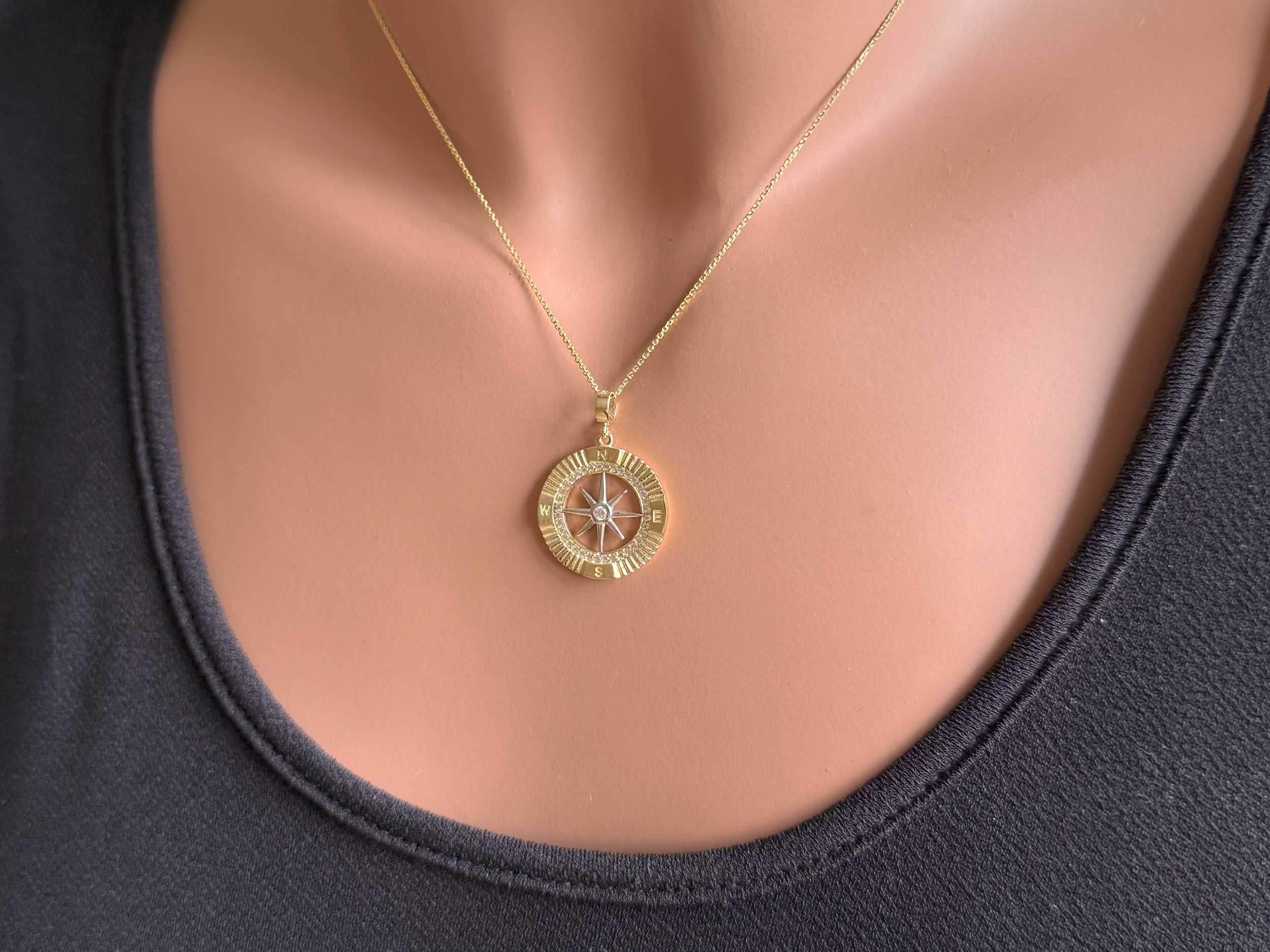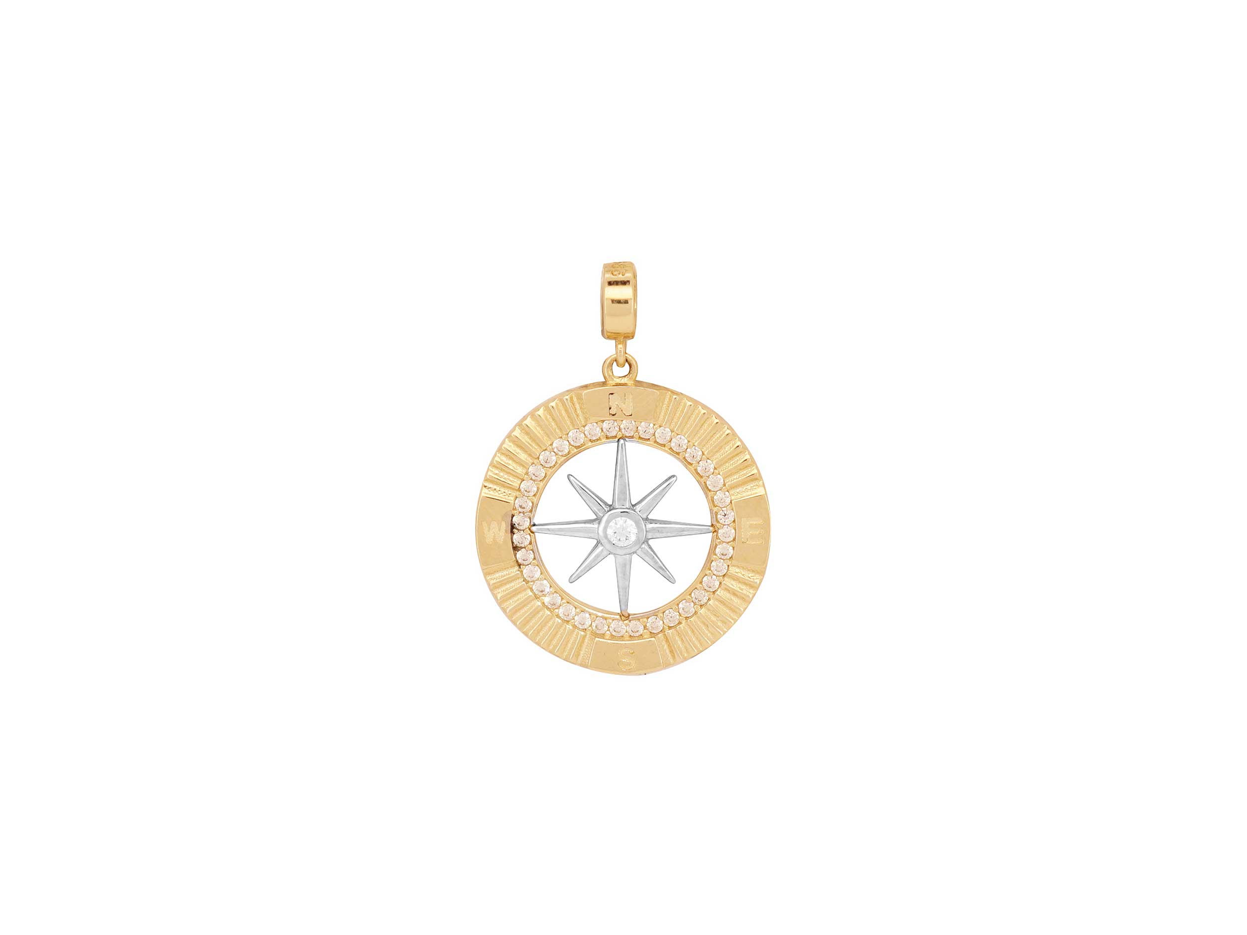 Μενταγιόν πυξίδα σε δίχρωμο χρυσό 14 Καρατίων. Κομψό και λαμπερό μενταγιόν σε κίτρινο χρυσό και λευκόχρυσο, με λουστρέ φινίρισμα, διακοσμημένο με λευκές cubic ζιργκόν πέτρες. Το συνολικό μήκος του με τον κρίκο είναι 2,70 cm. Μπορείτε να το συνδυάσετε με μια χρυσή αλυσίδα 14Κ.
