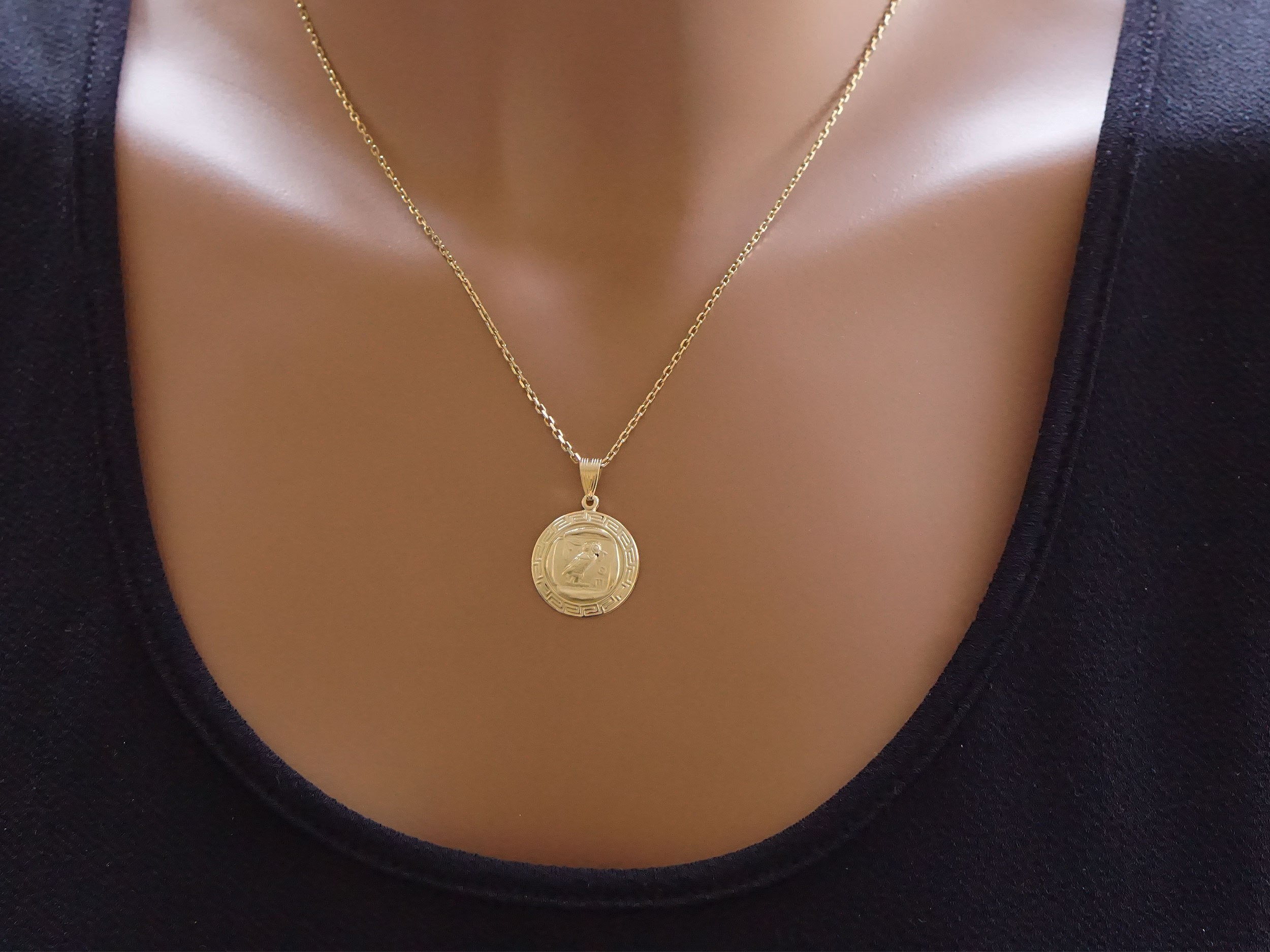 Χρυσό μενταγιόν στρογγυλό 9 Καρατίων, διακοσμημένο με ανάγλυφο σχέδιο κουκουβάγια στο κέντρο και με μαιάνδρους περιμετρικά. Έχει λουστρέ και ματ φινίρισμα και το συνολικό μήκος του με τον κρίκο είναι 2,50 cm. Συνδυάζεται άψογα με μια χρυσή αλυσίδα 9Κ ή με ένα μαύρο κορδόνι.