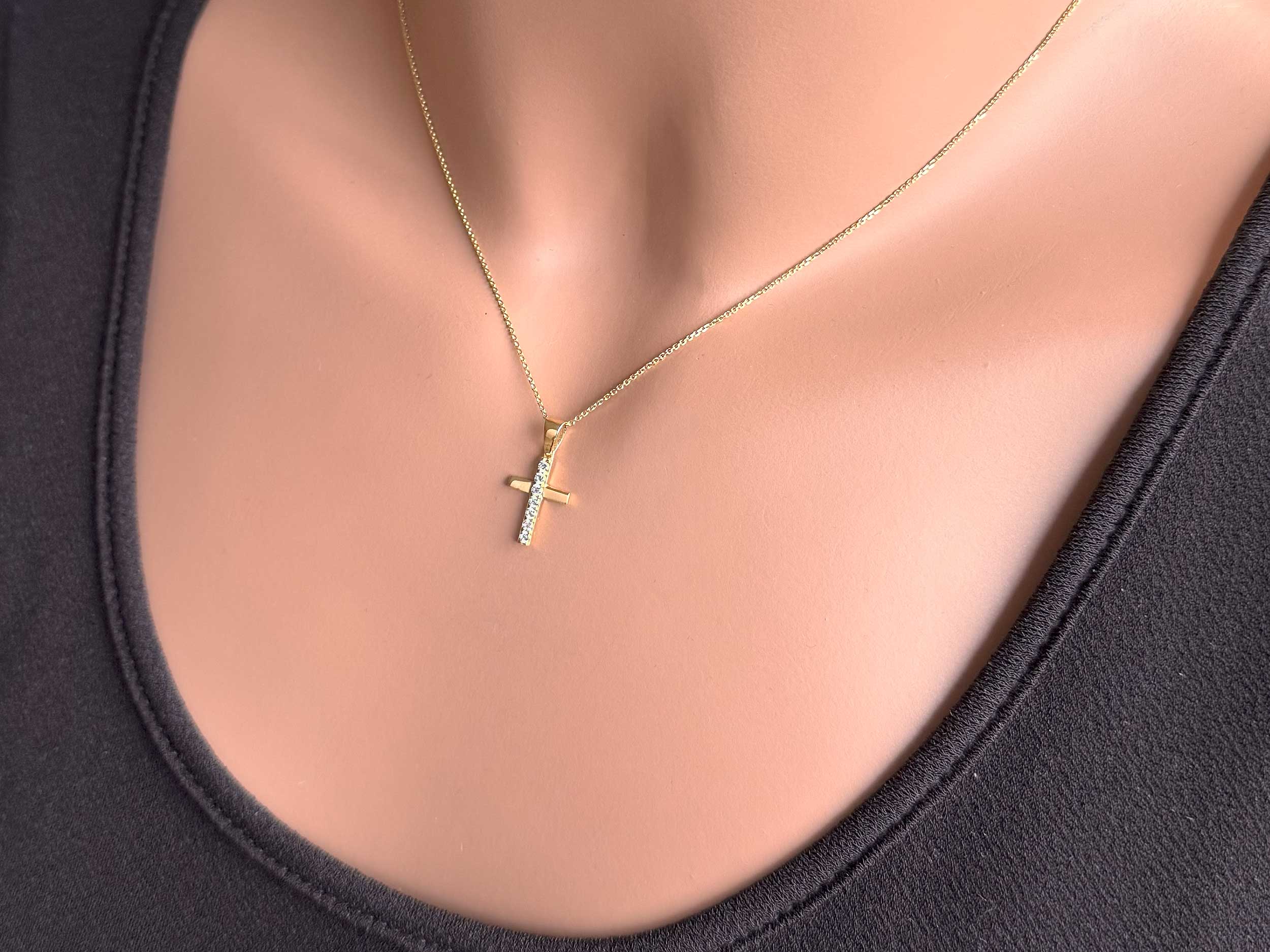 Χρυσό σταυρουδάκι γυναικείο 14 Καρατίων, με λουστρέ φινίρισμα. Το συνολικό μήκος του με τον κρίκο είναι 1,90 cm. Κοσμείται με μια κάθετη σειρά από λευκές cubic ζιργκόν πέτρες. Μπορείτε να το φοράτε καθημερινά με μια χρυσή αλυσίδα 14 Καράτια.