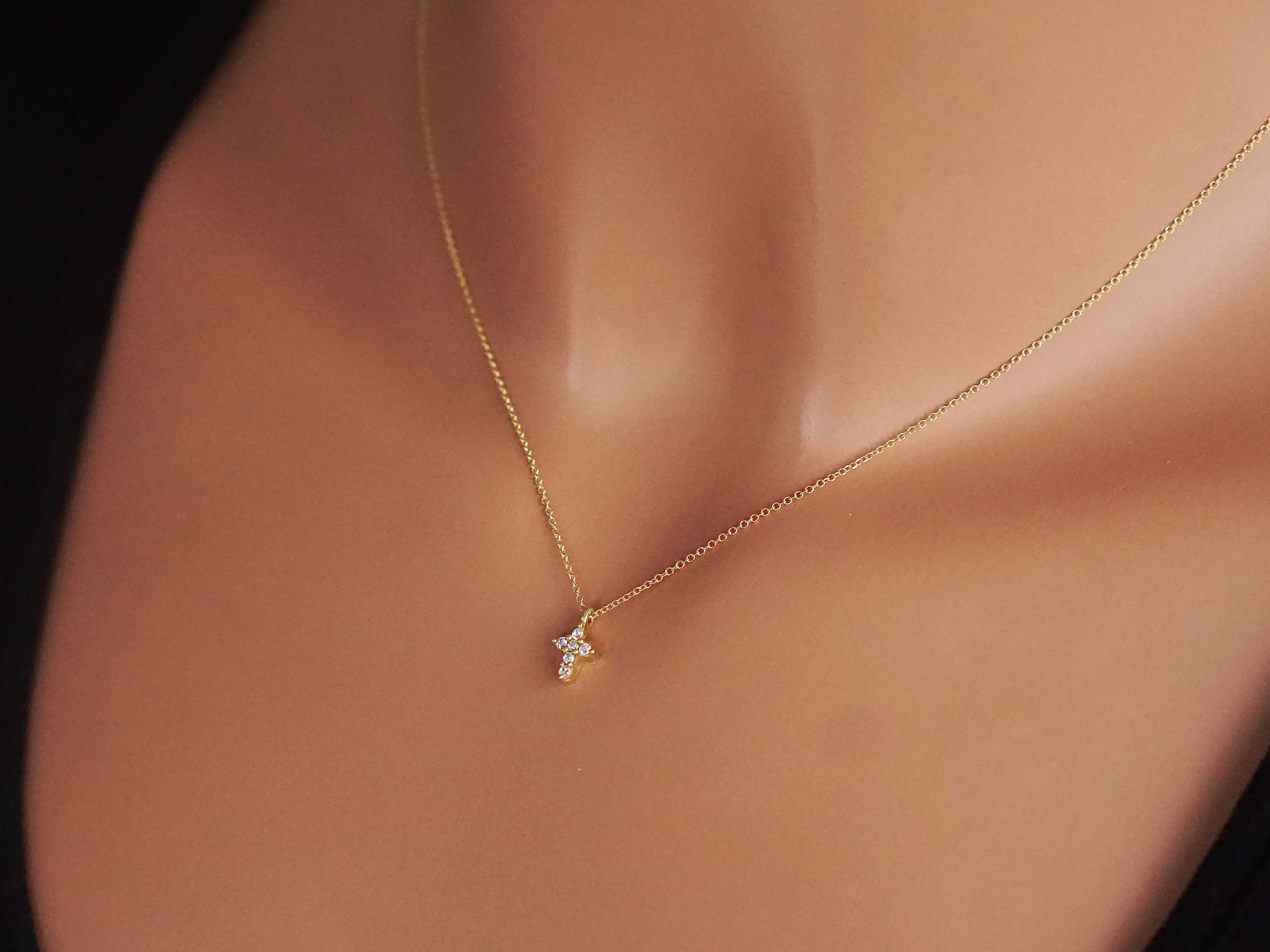 Σταυρουδάκι με μπριγιάν, σε χρυσό 14 Καρατίων. Ένα κομψό ολόπετρο σταυρουδάκι, διακοσμημένο με έξι διαμάντια κοπής round brilliant. Το συνολικό μήκος του είναι 0,90 cm. Συνοδεύεται από χρυσή αλυσίδα 14Κ, μήκους 40,00 cm.