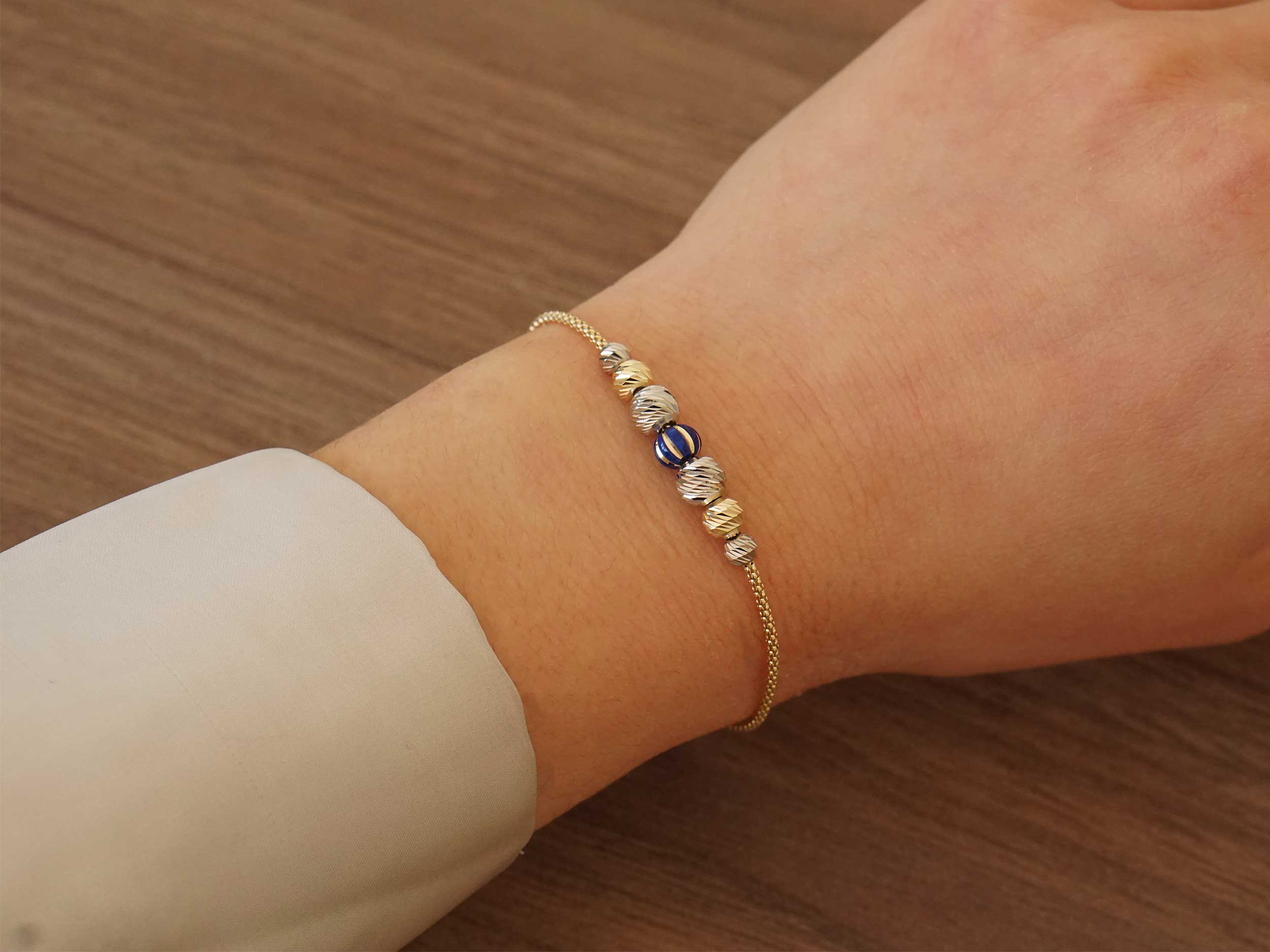 Χρυσό βραχιόλι 14Κ, με λουστρέ φινίρισμα και κίτρινο χρυσό χρώμα μετάλλου. Κοσμείται με δίχρωμες διαμανταρισμένες μπίλιες σε κίτρινο χρυσό και λευκόχρυσο και μια μπίλια στο κέντρο με μπλε σμάλτο. Η άκρη της αλυσίδας του είναι διακοσμημένη με λευκή ζιργκόν πέτρα σε μοτίφ αστεράκι.