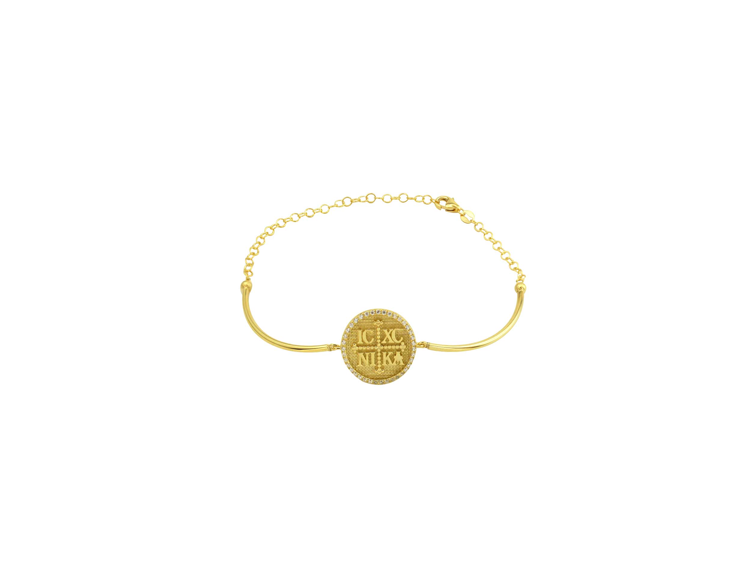 Βραχιόλι Κωνσταντινάτο χρυσό 14 Καρατίων. Κοσμείται με το ΙΧΝΚ και με λευκές cubic ζιργκόν πέτρες περιμετρικά. Το φινίρισμά του συνδυάζει λουστρέ και ζαγρέ. Ένα κομψό και συμβολικό κόσμημα, ιδανική επιλογή για δώρο.