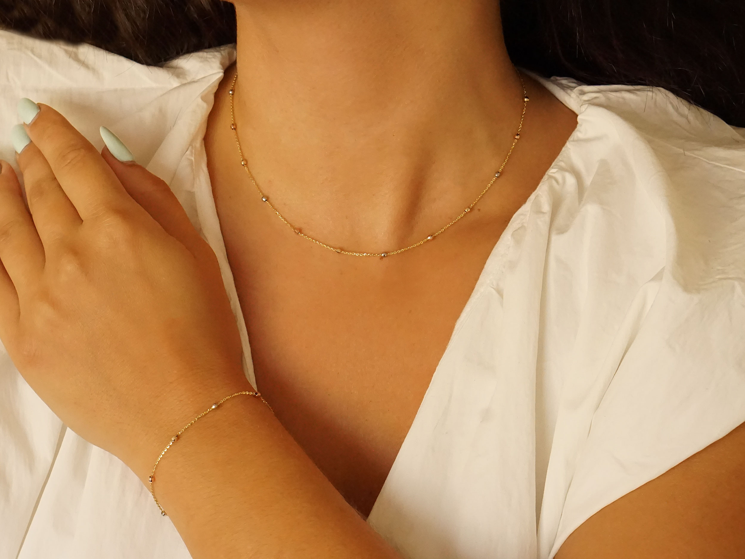 Χρυσό βραχιόλι με μπίλιες τρίχρωμες διαμανταρισμένες 14 Καρατίων. Ο συνδυασμός των τριών χρωμάτων προσφέρει μια μοντέρνα και κομψή πινελιά, ενώ το διακριτικό του design το καθιστά ιδανικό για να φορεθεί μόνο του ή σε συνδυασμό με άλλα βραχιόλια. Συνδυάστε το με το χρυσό κολιέ της ίδιας σειράς για μια απόλυτα κομψή και στιλάτη εμφάνιση.