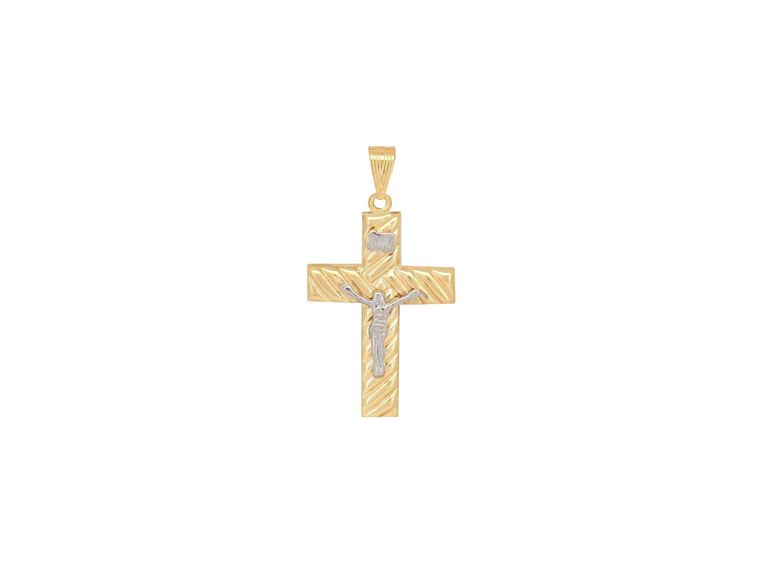 Χρυσός δίχρωμος σταυρός 9Καρατίων, με λουστρέ φινίρισμα. Κοσμείται με λευκόχρυσο Εσταυρωμένο και έχει υπέροχο ανάγλυφο σχεδιασμό και στις δύο όψεις. Το συνολικό μήκος του με τον κρίκο είναι 3,40 cm. Ένας κομψός και διαχρονικός σταυρός που μπορείτε να συνδυάσετε με μια χρυσή αλυσίδα.