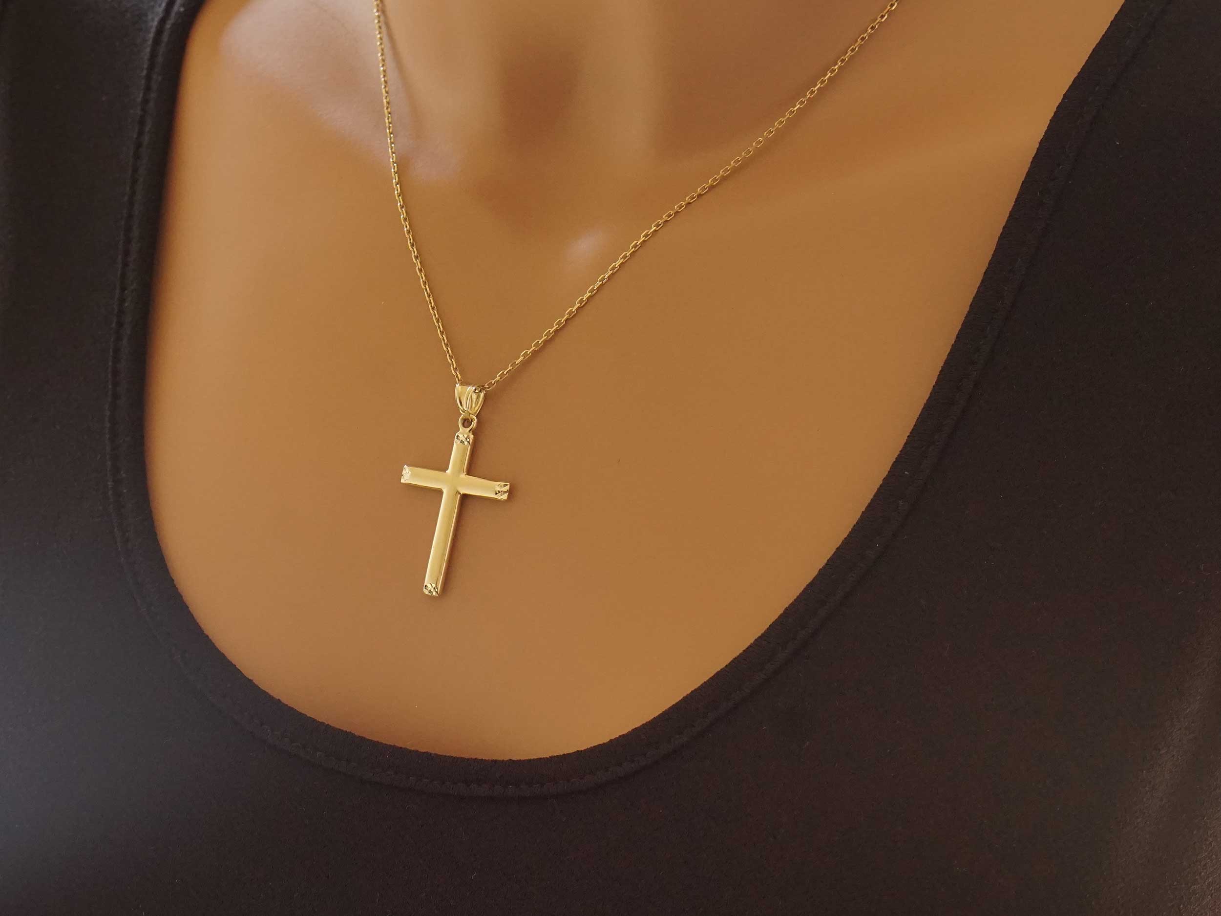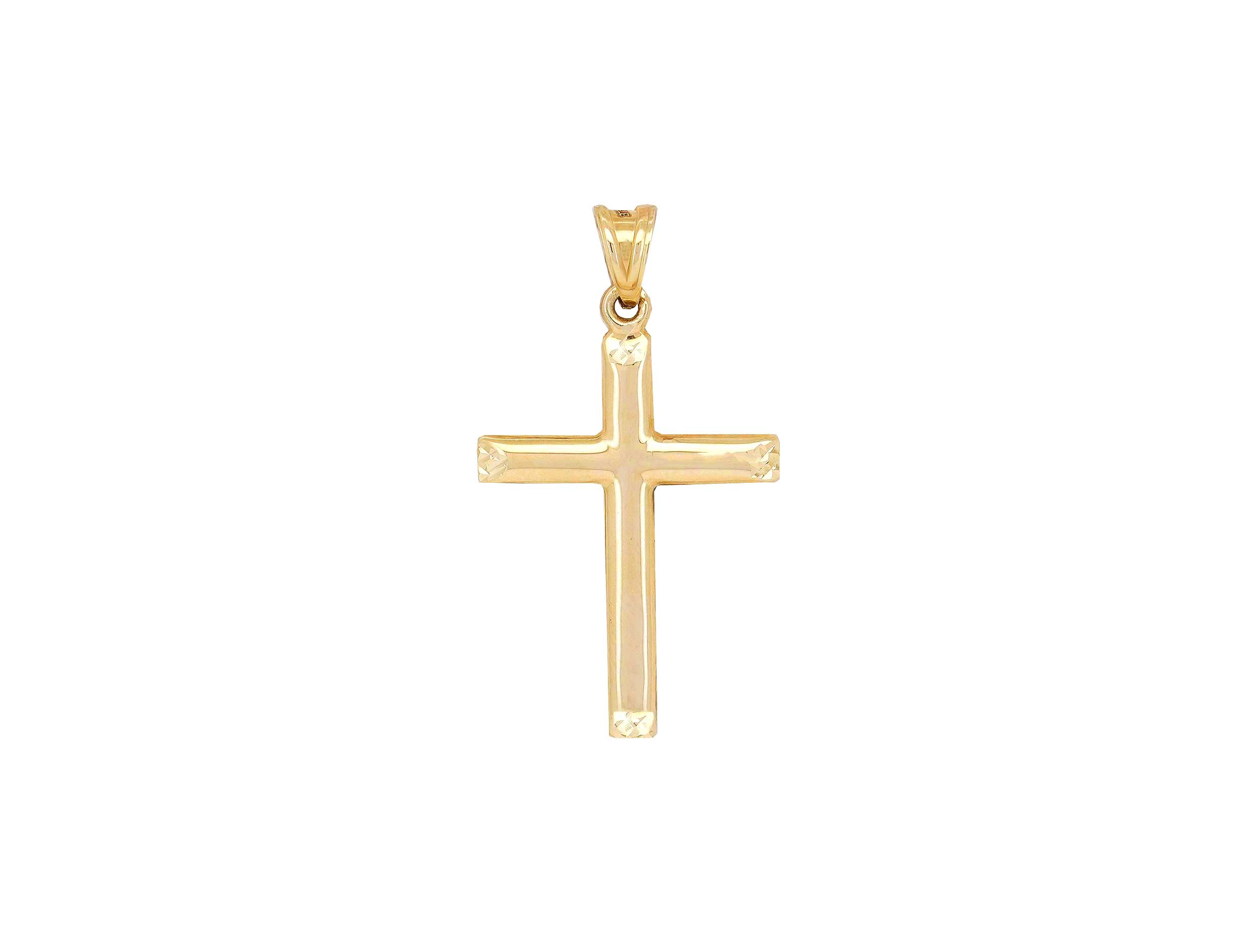 Χρυσός σταυρός 9Κ, διπλής όψης, με λουστρέ φινίρισμα και λαμπερό διαμαντάρισμα στις άκρες του. Το συνολικό μήκος του με τον κρίκο είναι 3,60 cm. Συνδυάζεται άψογα με τις χρυσές αλυσίδες της συλλογής μας.