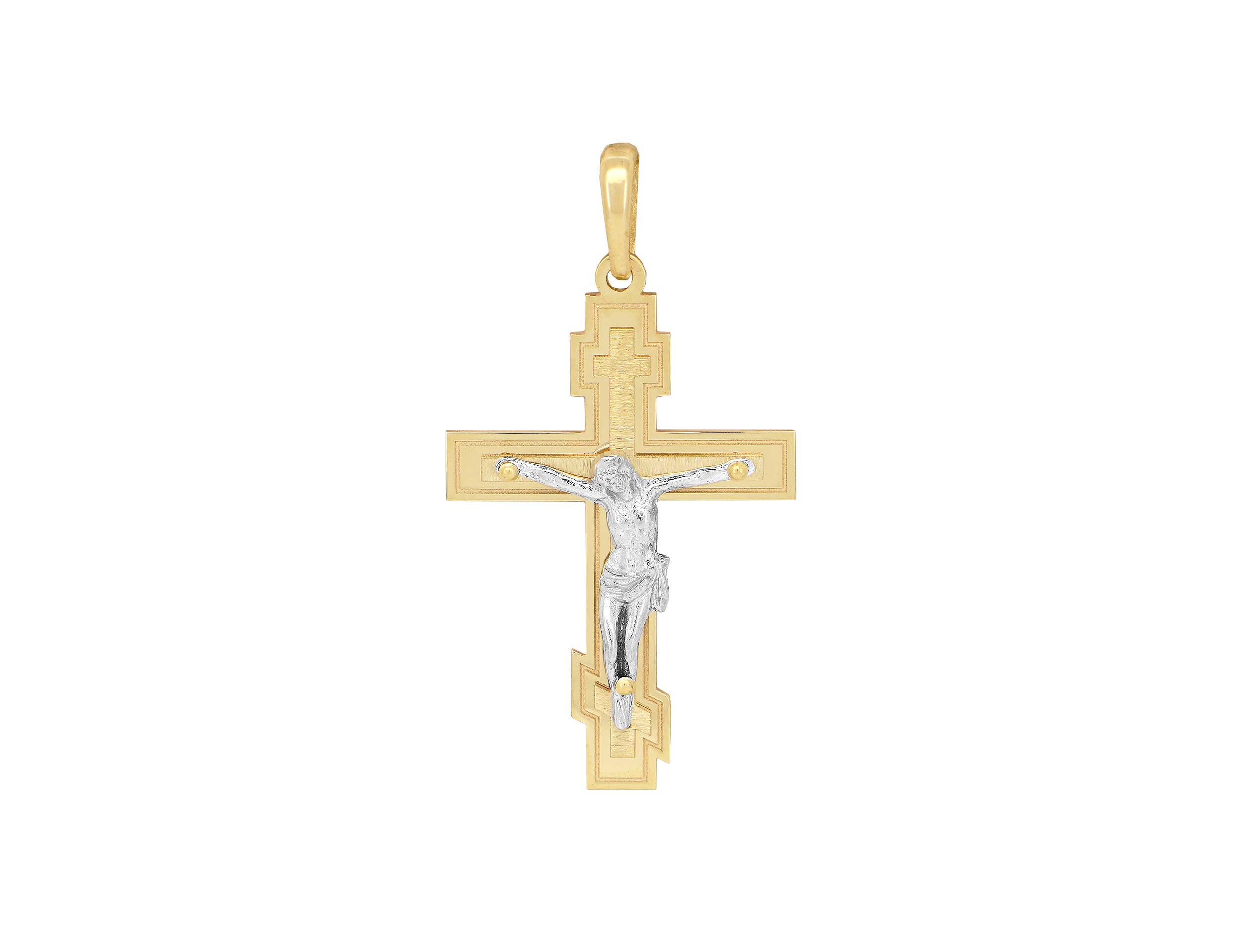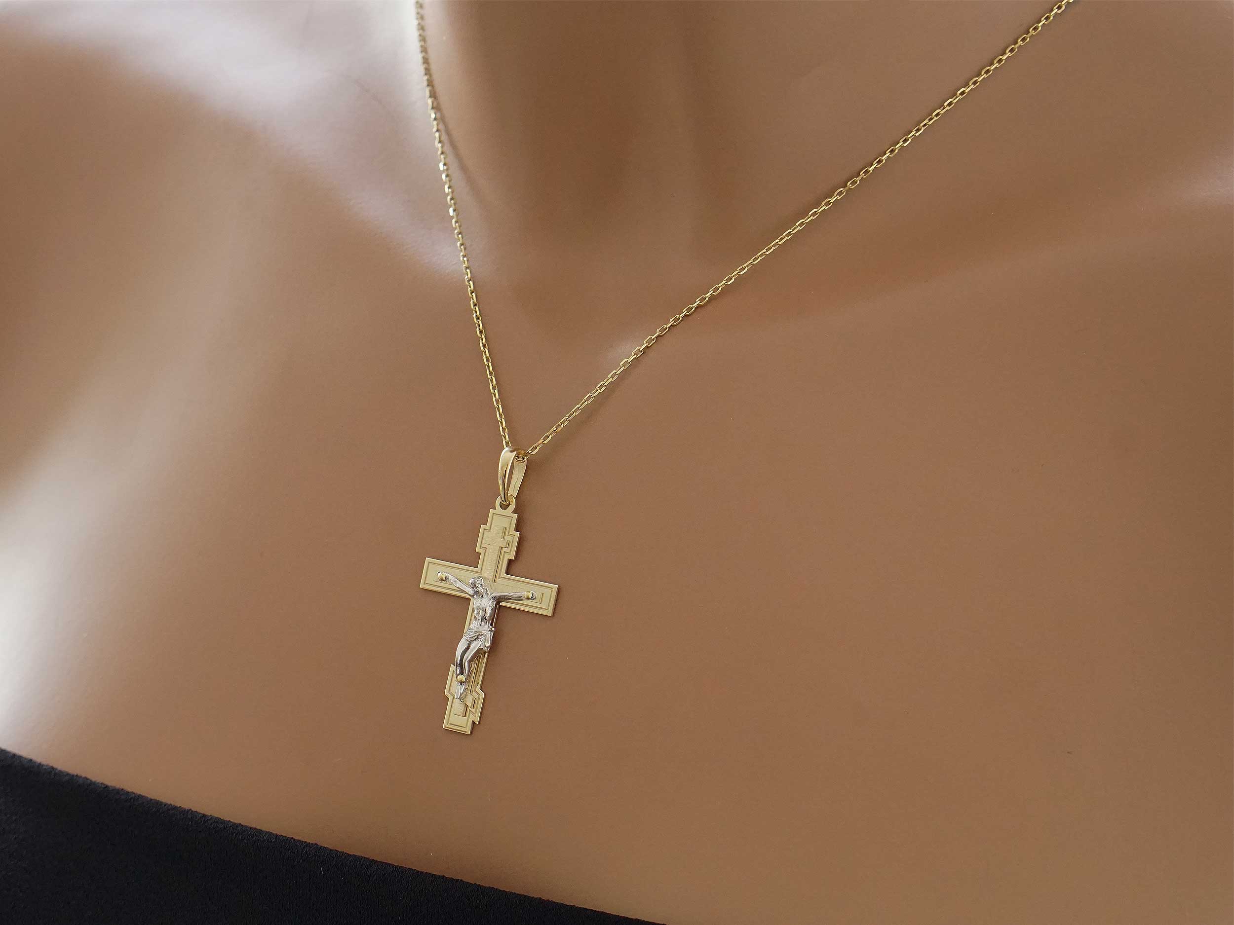 Χρυσός σταυρός δίχρωμος με λευκόχρυσο Εσταυρωμένο 14 Καρατίων. Έχει υπέροχο λουστρέ φινίρισμα με ζαγρέ λεπτομέρειες και το συνολικό μήκος του με τον κρίκο είναι 4,50 cm. Μπορεί να φορεθεί με μια χρυσή αλυσίδα 14Κ.