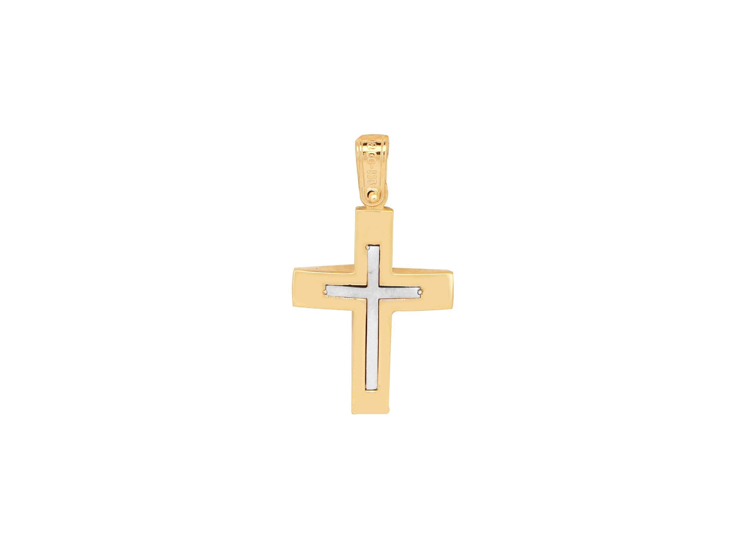 Δίχρωμος χρυσός σταυρός διπλής όψης 14 Καρατίων. Η μπροστινή όψη του συνδυάζει λουστρέ και ματ φινίρισμα σε κίτρινο χρυσό και λευκόχρυσο και η πίσω όψη του έχει υπέροχο κυματιστό σχέδιο. Το συνολικό μήκος του με τον κρίκο είναι 3,30 cm. Ένας διαχρονικός σταυρός για βάπτιση και αρραβώνα, που μπορεί να συνδυαστεί με χρυσή αλυσίδα 14Κ.