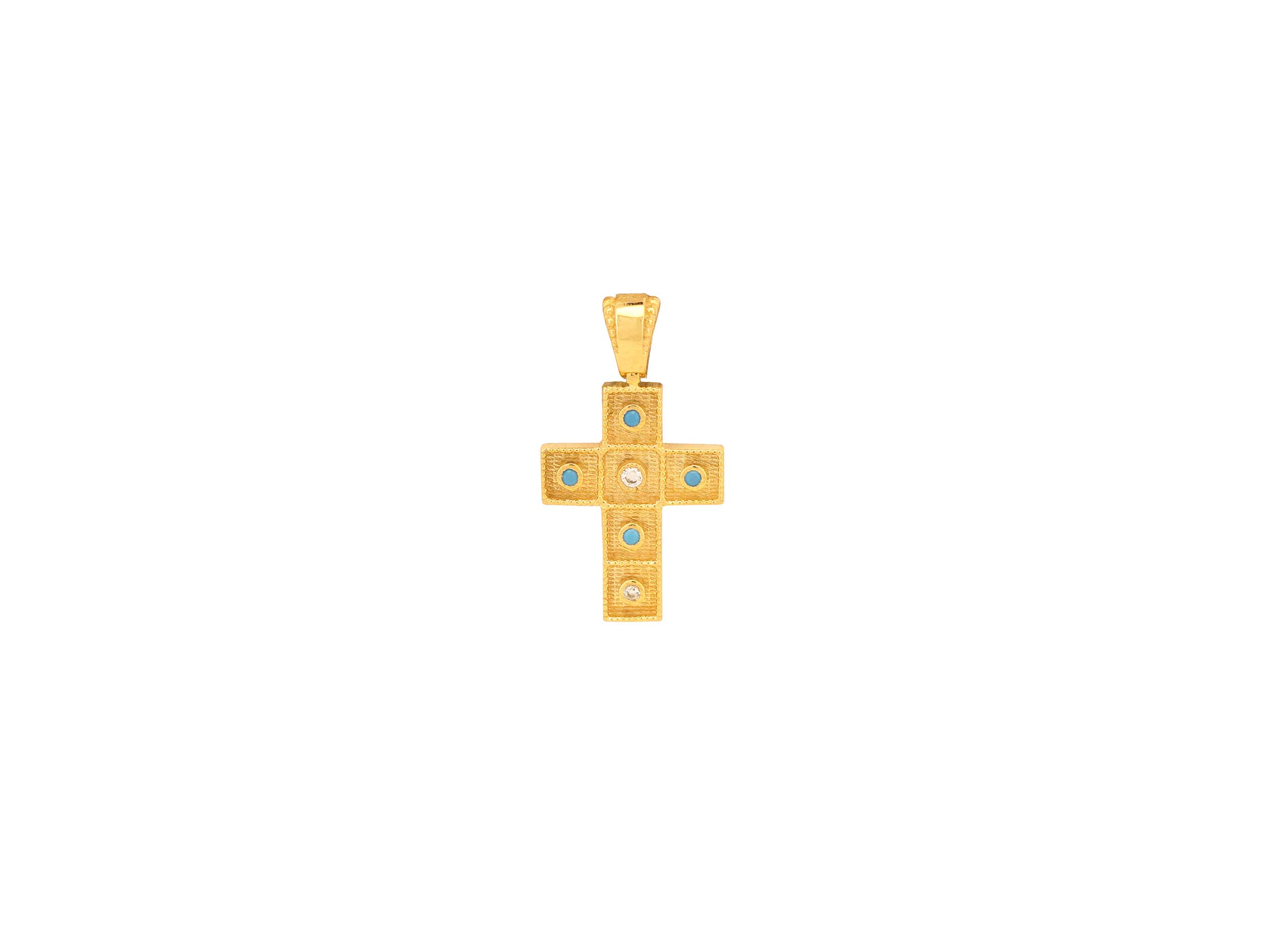 Χρυσός σταυρός δύο όψεων 14 Καρατίων. Έχει λουστρέ και ζαγρέ φινίρισμα και το συνολικό μήκος του είναι 2,20 cm. Η μία όψη του κοσμείται με δύο λευκές και τέσσερις γαλάζιες cubic ζιργκόν πέτρες που προσθέτουν χρώμα και λάμψη. Η πίσω όψη του έχει υπέροχο ανάγλυφο σχέδιο. Συνδυάζεται άψογα με μια χρυσή αλυσίδα 14Κ.