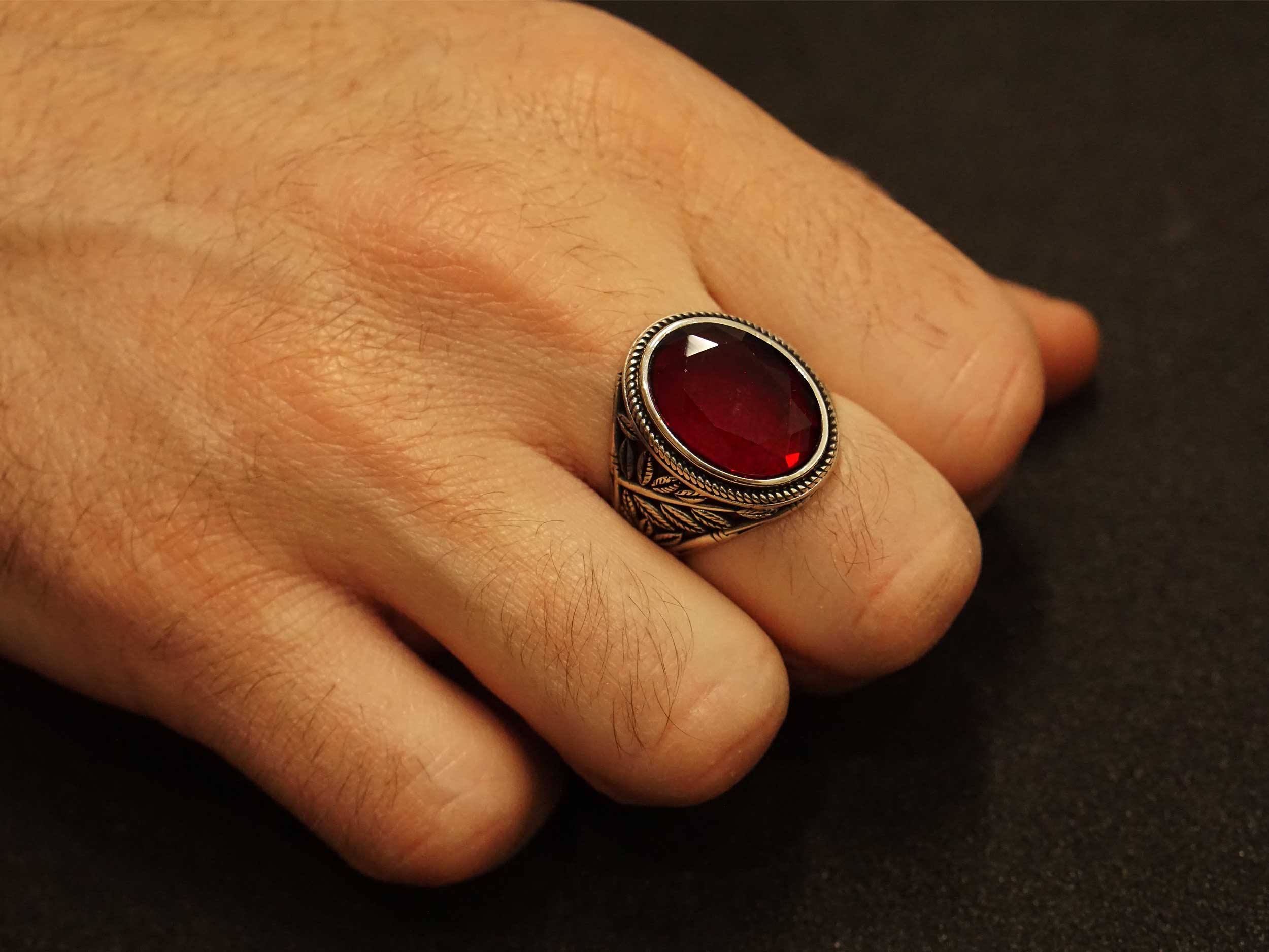 Δαχτυλίδι ανδρικό με πέτρα κόκκινη ζιργκόν και υπέροχα διάτρητα σχέδια με μαύρο oxyde στη γάμπα. Ένα εντυπωσιακό δαχτυλίδι από ασήμι 925, ιδανικό για επιβλητικές παρουσίες.