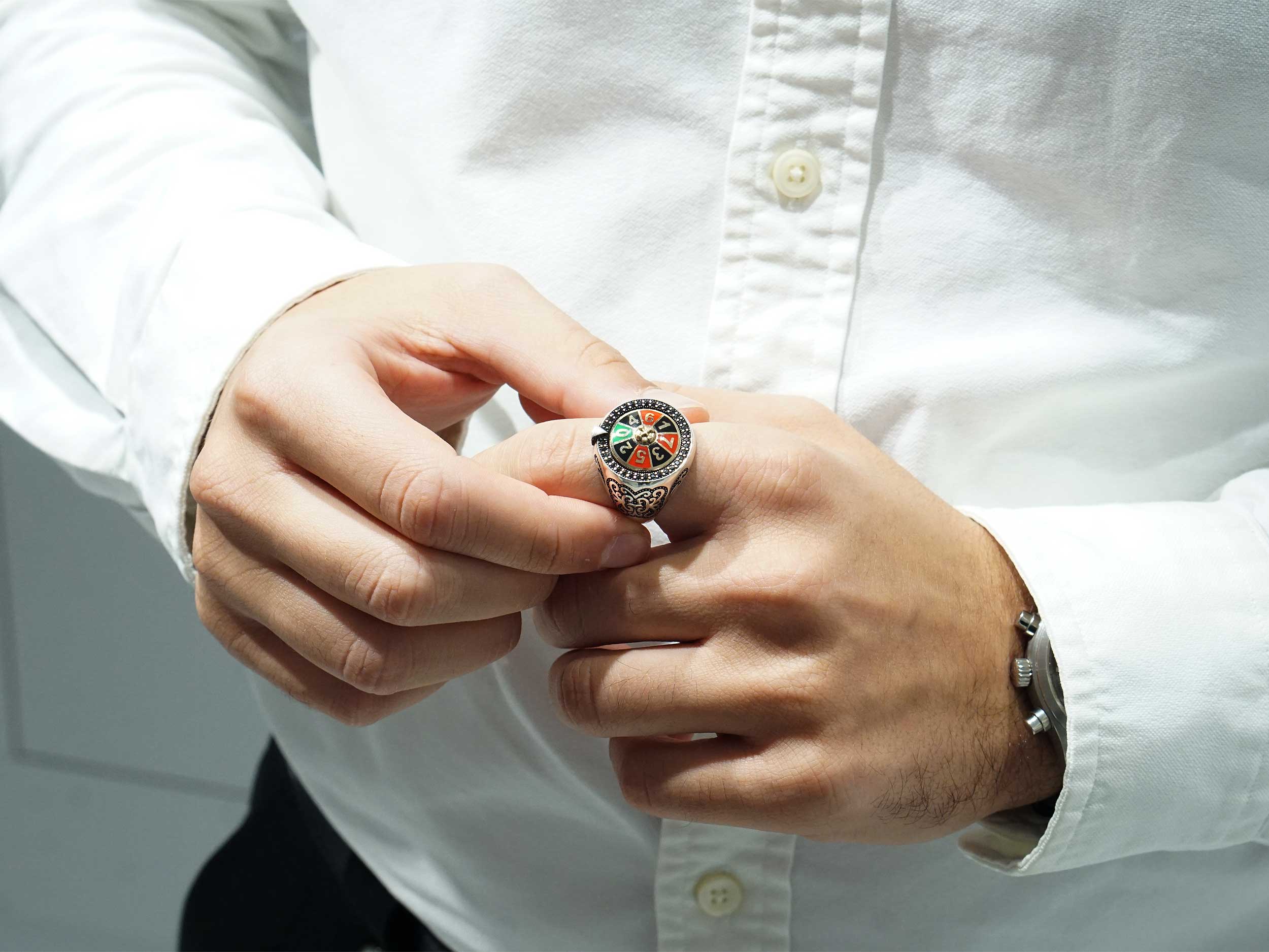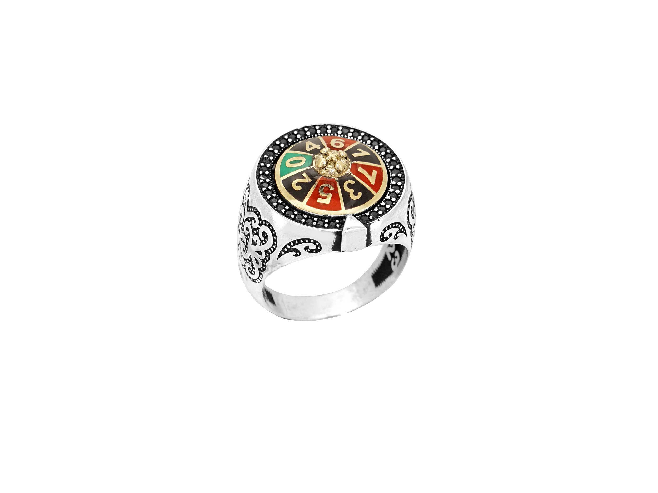 Δαχτυλίδι ασημένιο ανδρικό 925, με λουστρέ φινίρισμα. Κοσμείται με κόκκινο, μαύρο και πράσινο σμάλτο, μαύρες cubic ζιργκόν πέτρες περιμετρικά, επίχρυσες λεπτομέρειες και ανάγλυφα σχέδια με μαύρο oxyde. Ένα εντυπωσιακό κόσμημα για εμφανίσεις που θα ξεχωρίσουν.