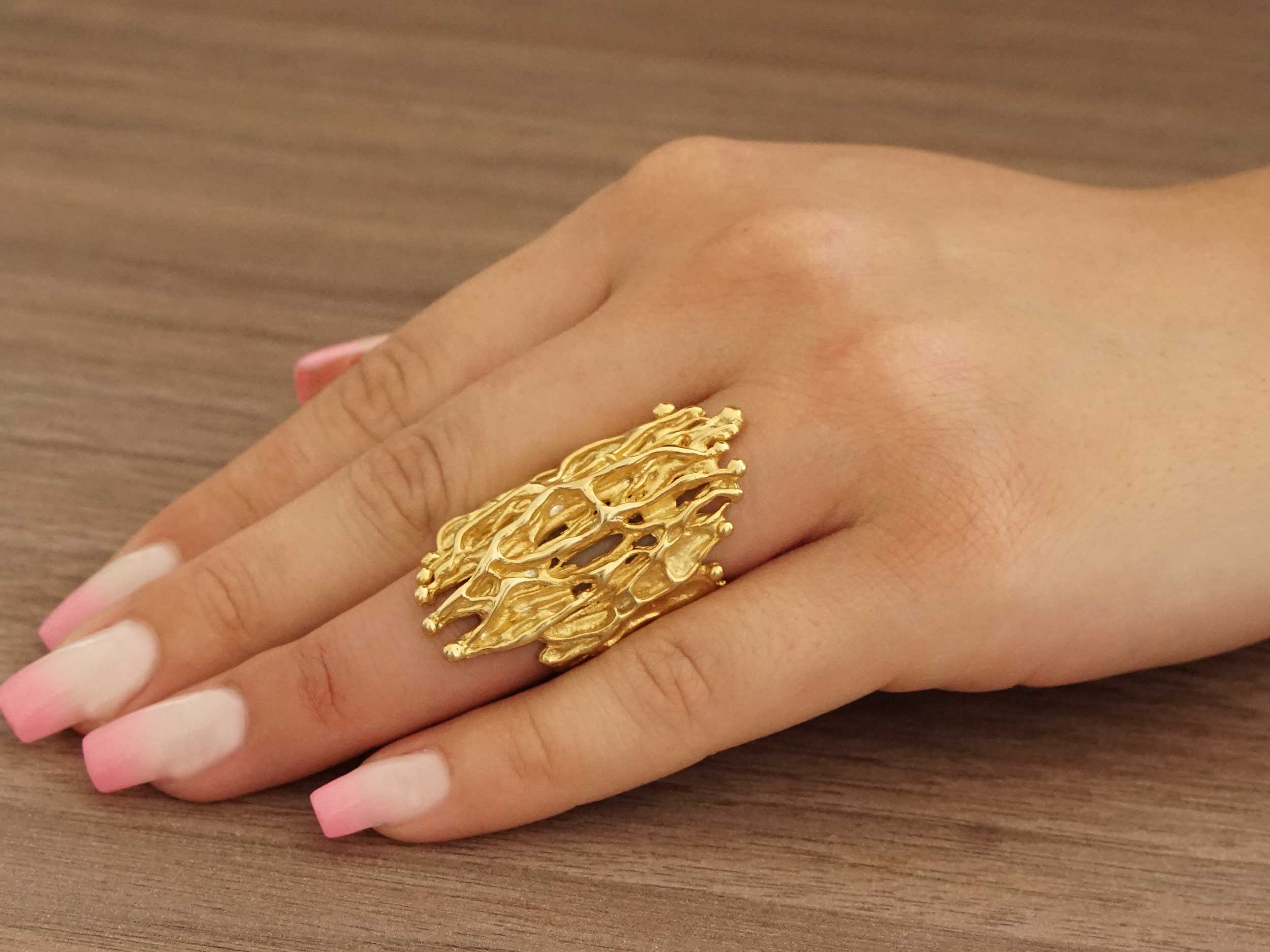 Χειροποίητο δαχτυλίδι επίχρυσο, σε ασήμι 925. Ένα πολύ ιδιαίτερο και εντυπωσιακό δαχτυλίδι, με ανάγλυφο σχέδιο και λουστρέ-ζαγρέ φινίρισμα. Επιλέξτε το για να ξεχωρίσετε σε οποιαδήποτε περίσταση!