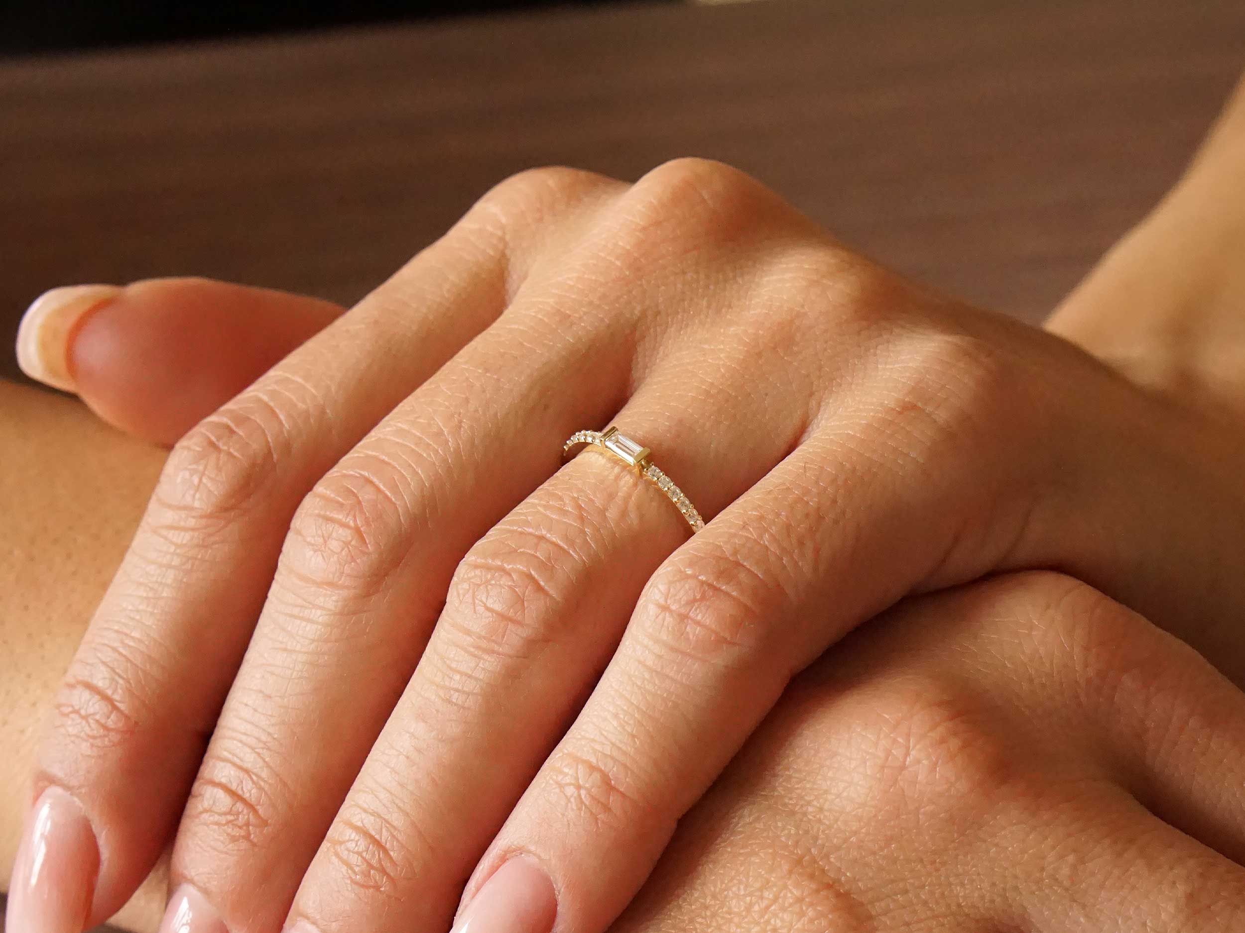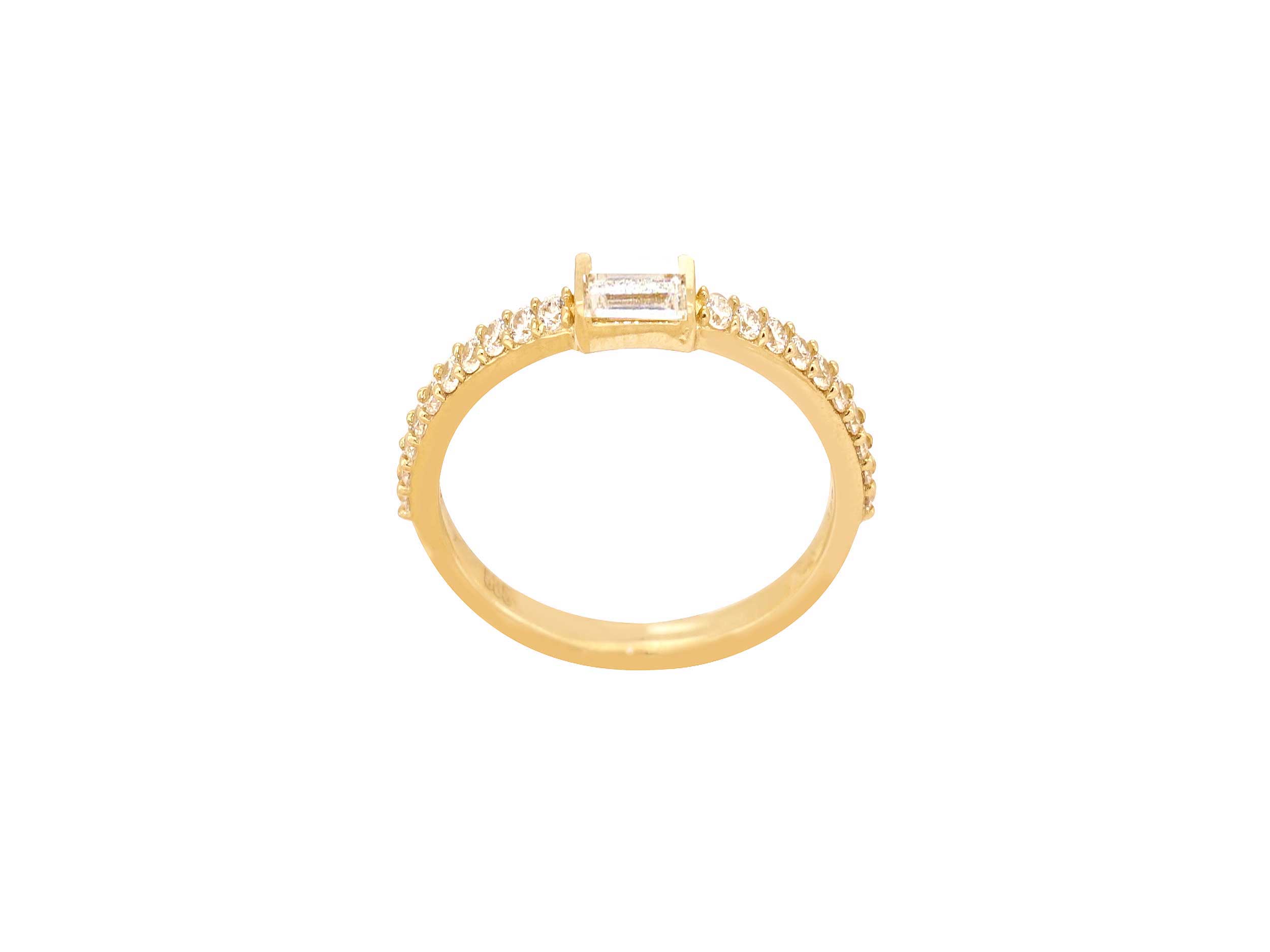 Γυναικείο δαχτυλίδι χρυσό 14Καράτια, με λουστρέ φινίρισμα. Κοσμείται με μια σειρά από λευκές cubic ζιργκόν πέτρες και με μια κεντρική πέτρα ζιργκόν σε σχήμα baguette. Ένα κομψό δαχτυλίδι που θα συνοδεύει τις καθημερινές σας εμφανίσεις!