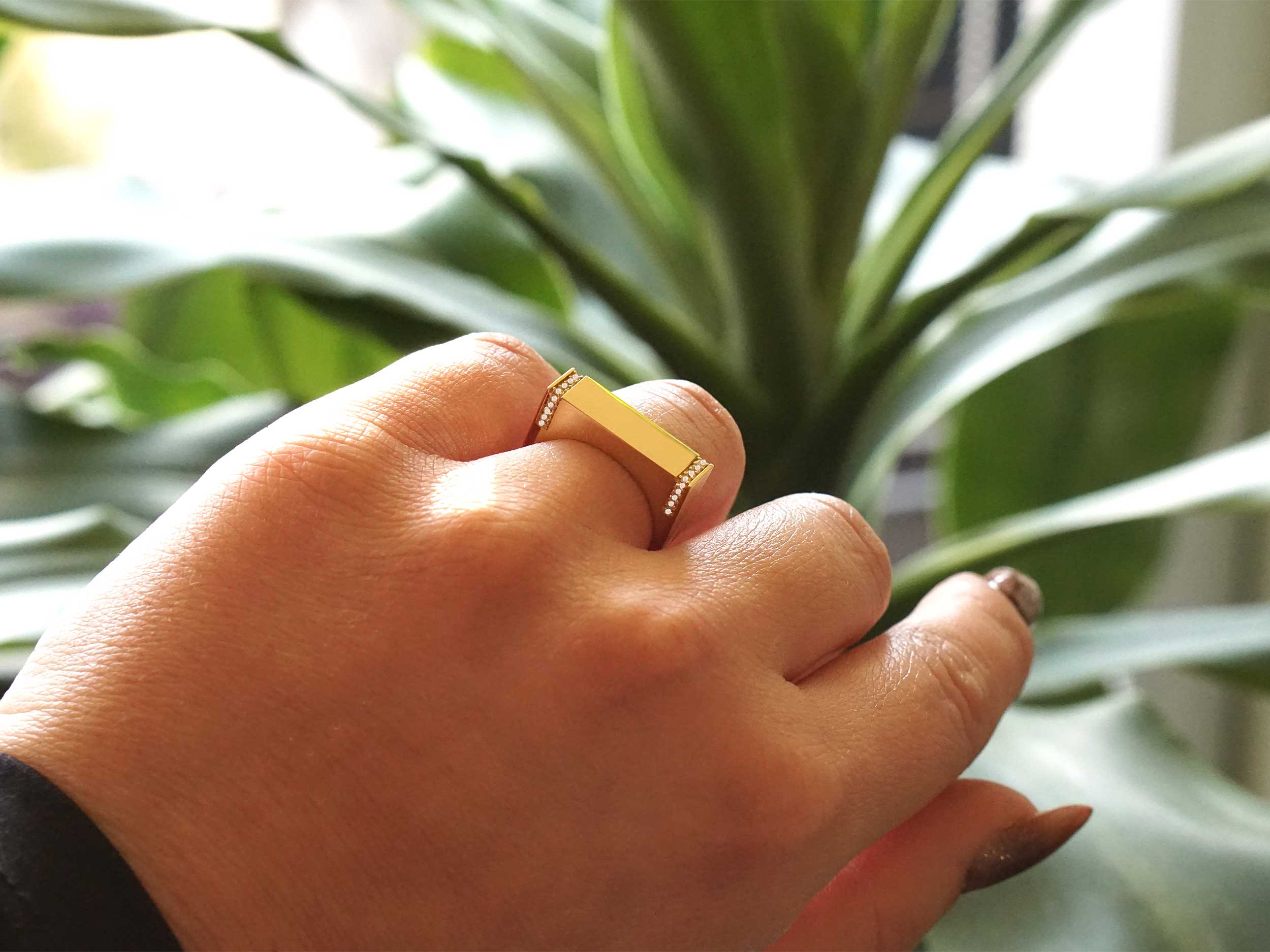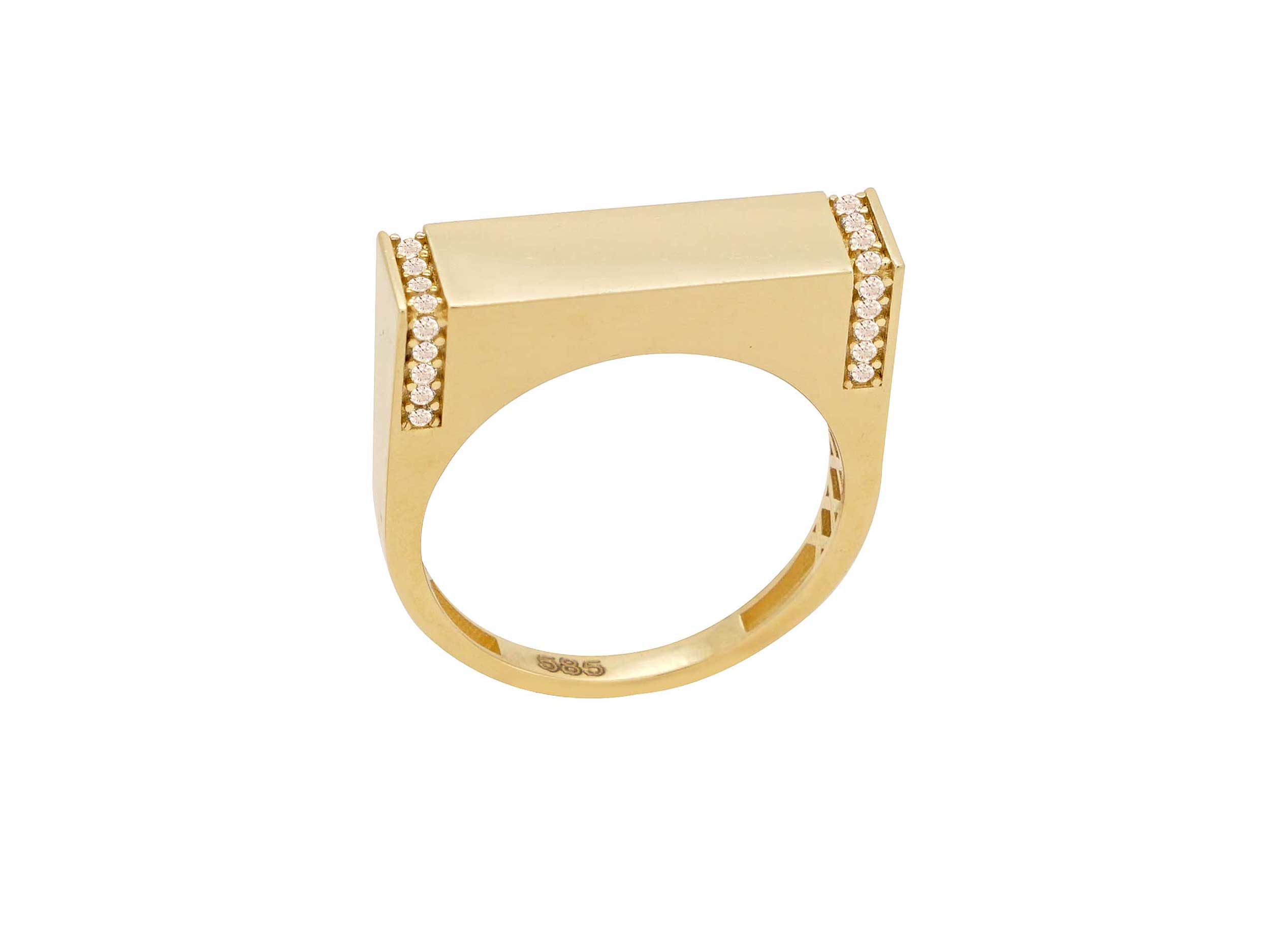 Δαχτυλίδι χρυσό 14Κ, με λουστρέ φινίρισμα. Διαθέτει μια ορθογώνια μπάρα διακοσμημένη με λαμπερές cubic ζιργκόν πέτρες σε λευκό χρώμα στα πλαϊνά. Με τον μοντέρνο και minimal χαρακτήρα του, αποτελεί ένα εξαιρετικό statement κομμάτι που μπορεί να φορεθεί μόνο του, προσδίδοντας στιλ σε κάθε σας εμφάνιση.