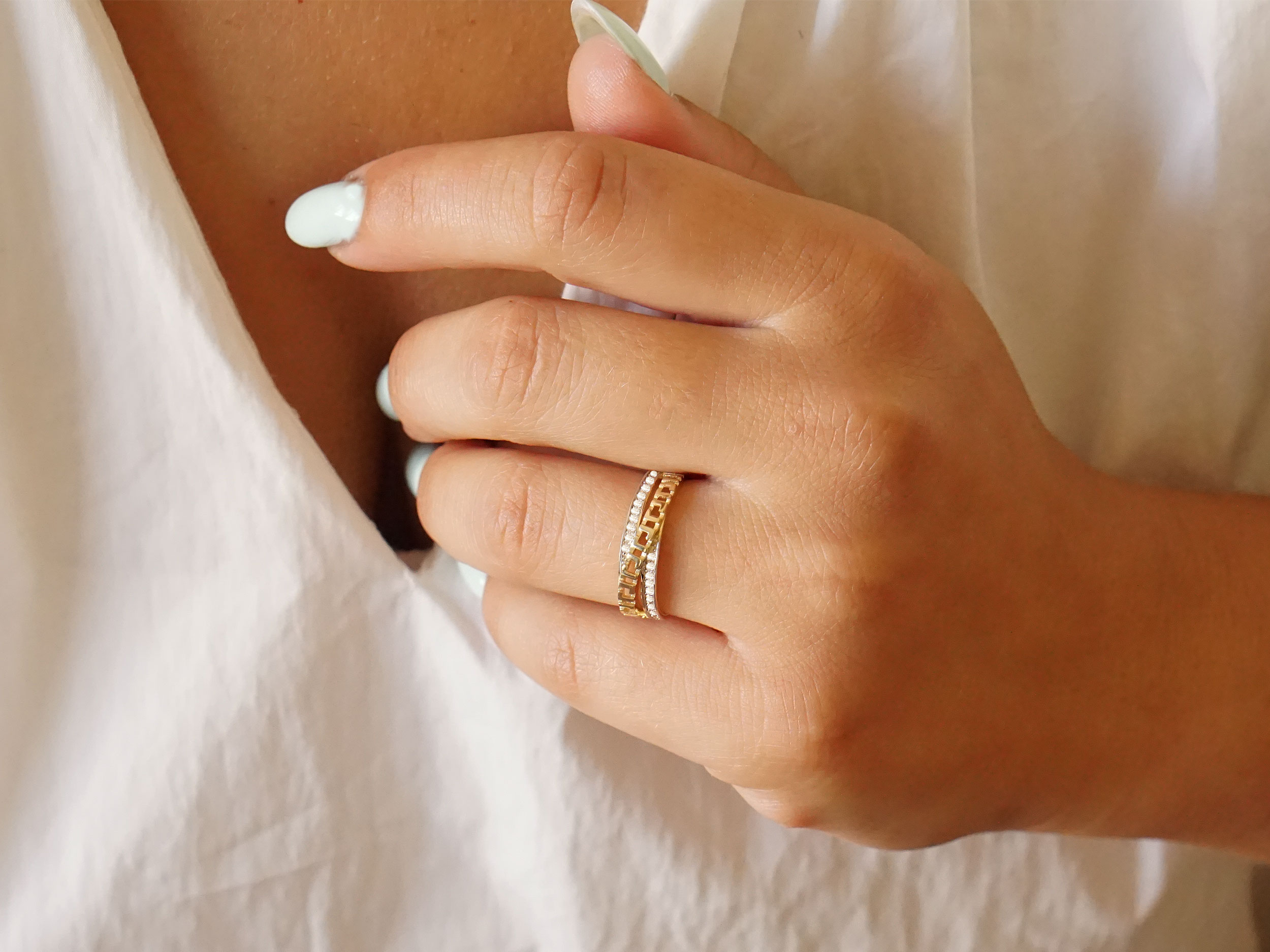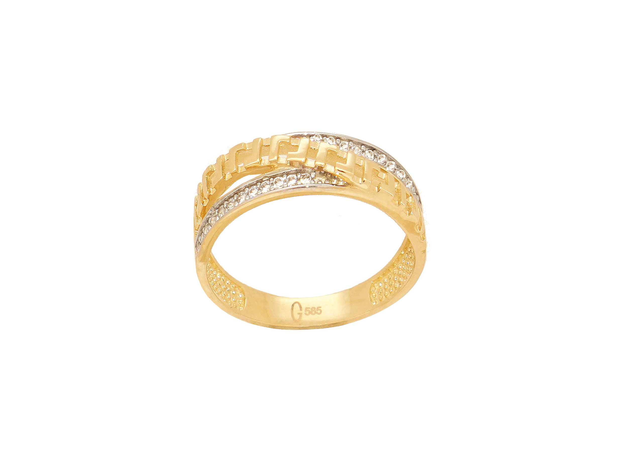 Δαχτυλίδι χρυσό δίχρωμο 14 Καρατίων, με λουστρέ φινίρισμα. Έχει κίτρινο χρυσό χρώμα με λευκόχρυσες λεπτομέρειες και είναι διακοσμημένο με μαιάνδρους και με λευκές cubic ζιργκόν πέτρες. Ένα κομψό και διαχρονικό κόσμημα με περίτεχνο σχέδιο, κατάλληλο για κάθε περίσταση.