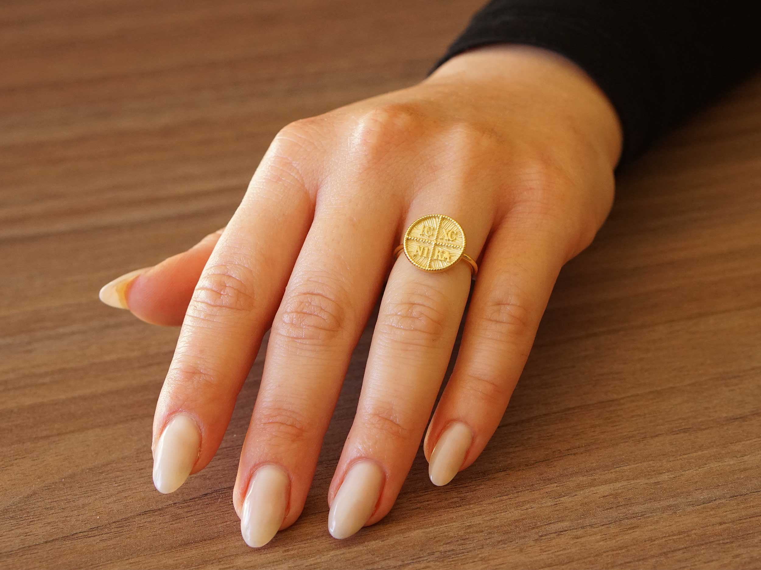Δαχτυλίδι χρυσό κωνσταντινάτο 14 Καρατίων. Κοσμείται με ανάγλυφο ΙΧΝΚ και συνδυάζει λουστρέ και ζαγρέ φινίρισμα. Κομψό δαχτυλίδι με συμβολικό χαρακτήρα, ιδανική επιλογή για δώρο.