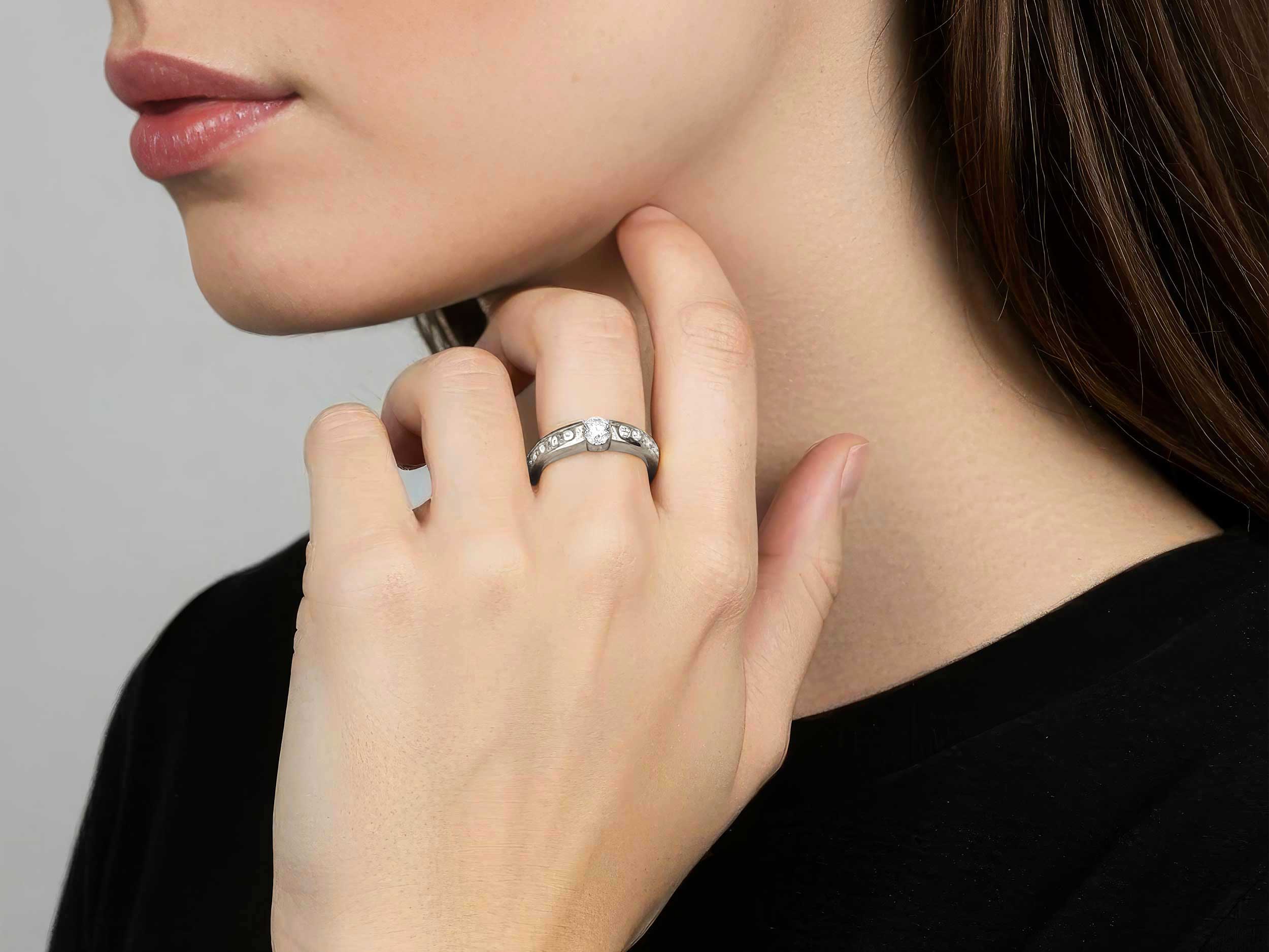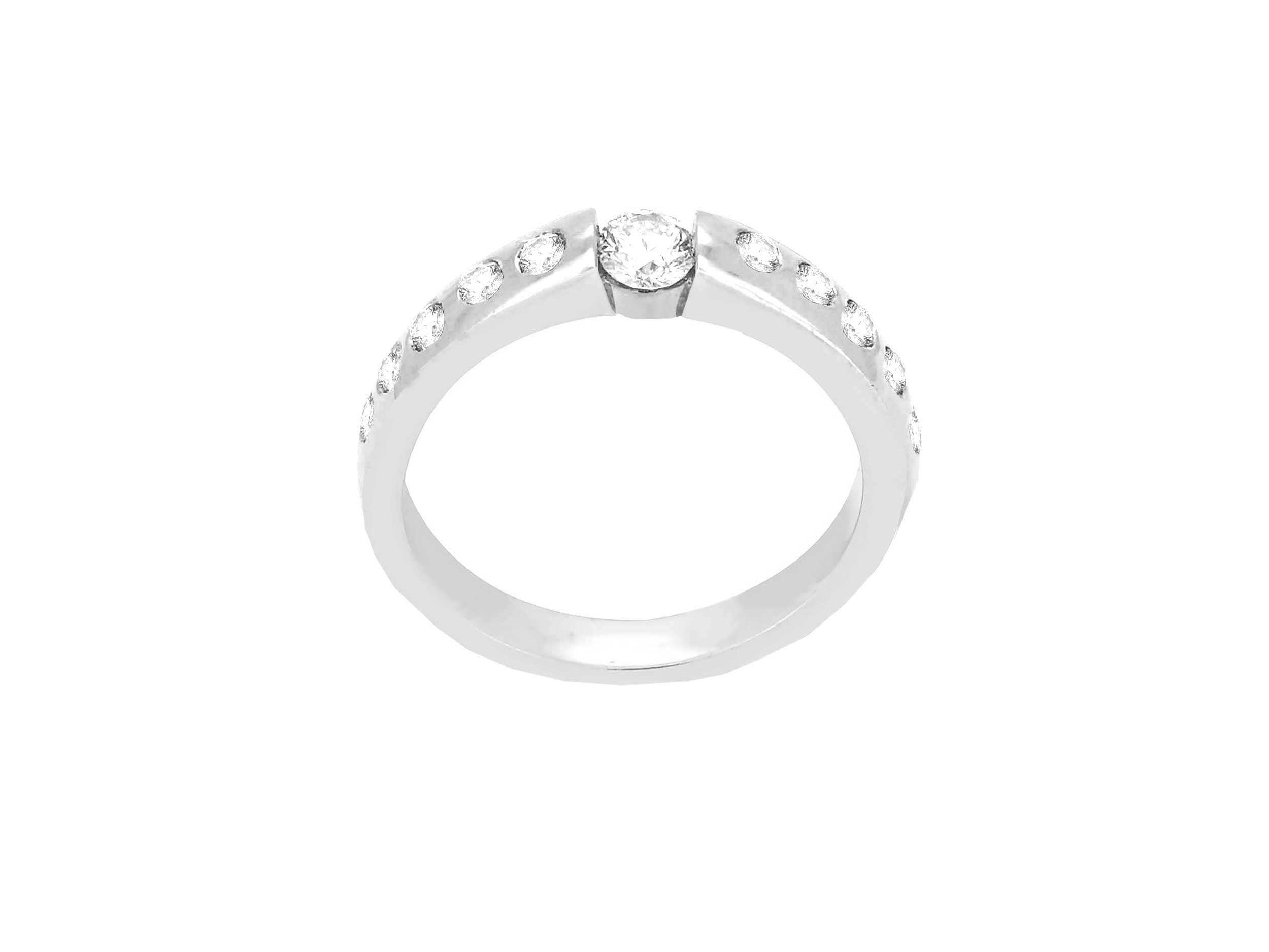 Δαχτυλίδι με διαμάντια λευκόχρυσο 18 Καρατίων, με λουστρέ φινίρισμα. Είναι διακοσμημένο με ένα κεντρικό διαμάντι round brilliant cut 0,18 ct και με 10 διαμάντια μπριγιάν 0,20 ct στη γάμπα, που θα λάμπουν στο χέρι σας!
