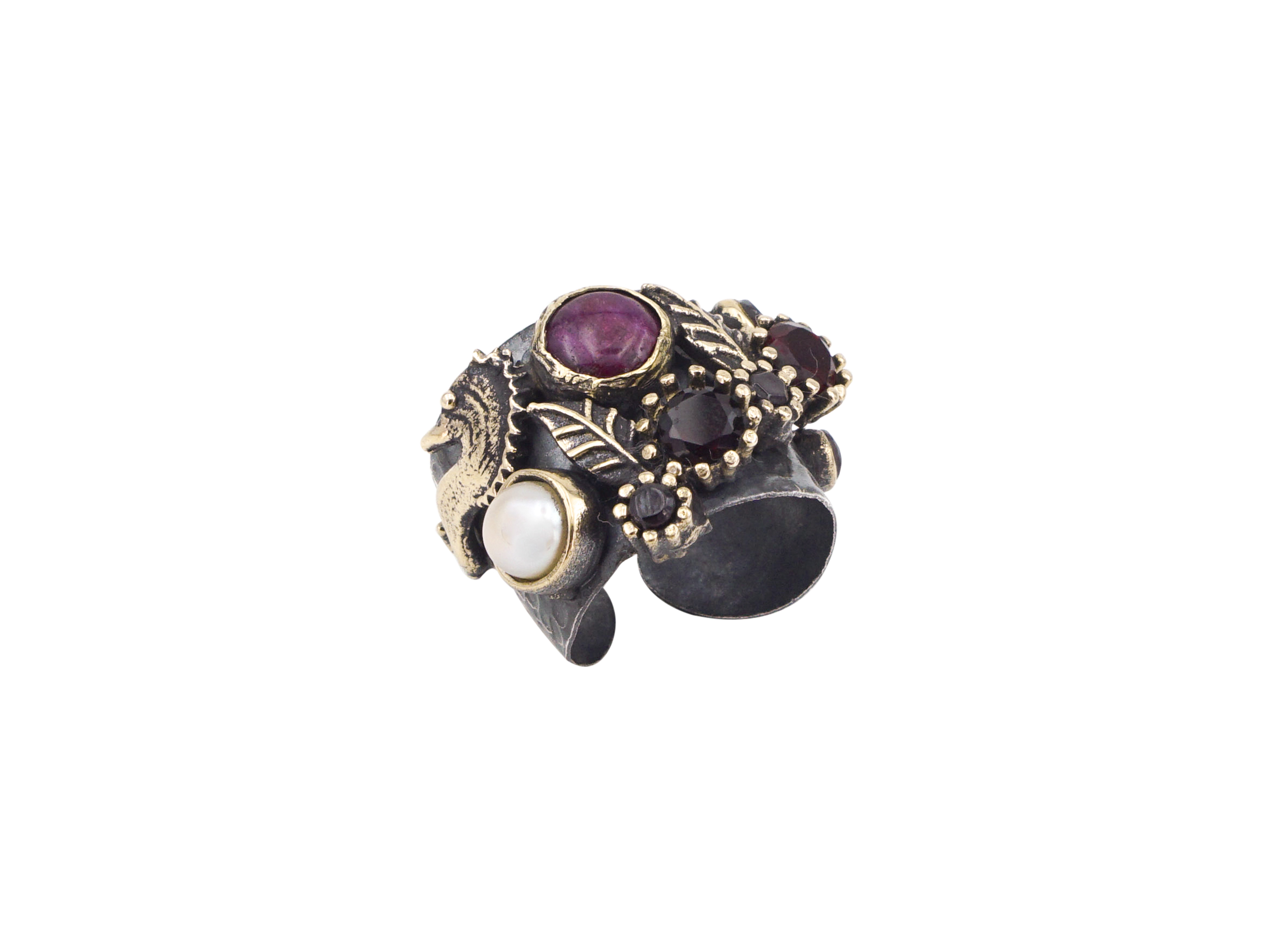 Ιδιαίτερο γυναικείο δαχτυλίδι για κυρίες με στυλ. Δαχτυλίδι με κόκκινη πέτρα cubic ζιργκόν και λευκό μαργαριτάρι. Μοντέρνο κόσμημα από ασήμι 925 που ανοιγοκλείνει και έχει λουστρέ φινίρισμα και χρώμα μετάλλου κίτρινο και μαύρο oxyde. Είναι άμεσα διαθέσιμο. Θα σας αποσταλεί σε πολυτελή συσκευασία δώρου.
