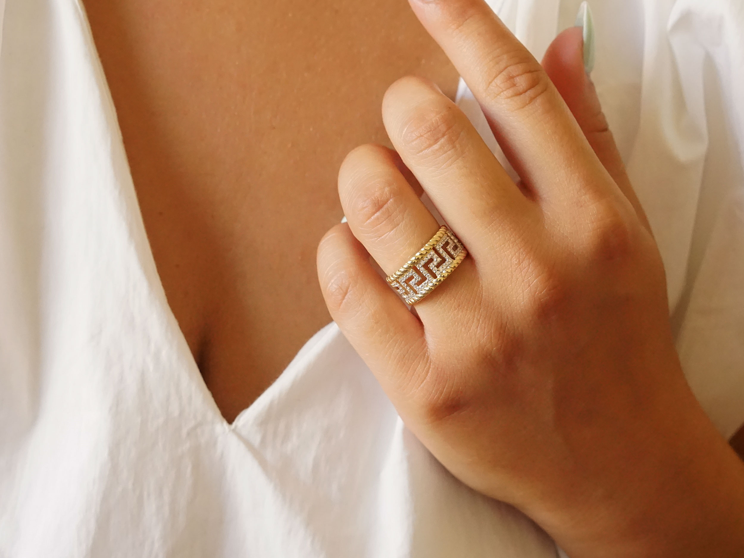 Δαχτυλίδι με μαίανδρο και ζιργκόν πέτρες, σε χρυσό 14 Καρατίων. Κοσμείται με ανάγλυφο σχέδιο και μαιάνδρους με λευκές cubic ζιργκόν πέτρες. Ένα εντυπωσιακό κόσμημα που θα προσθέσει λάμψη και στυλ στις εμφανίσεις σας.