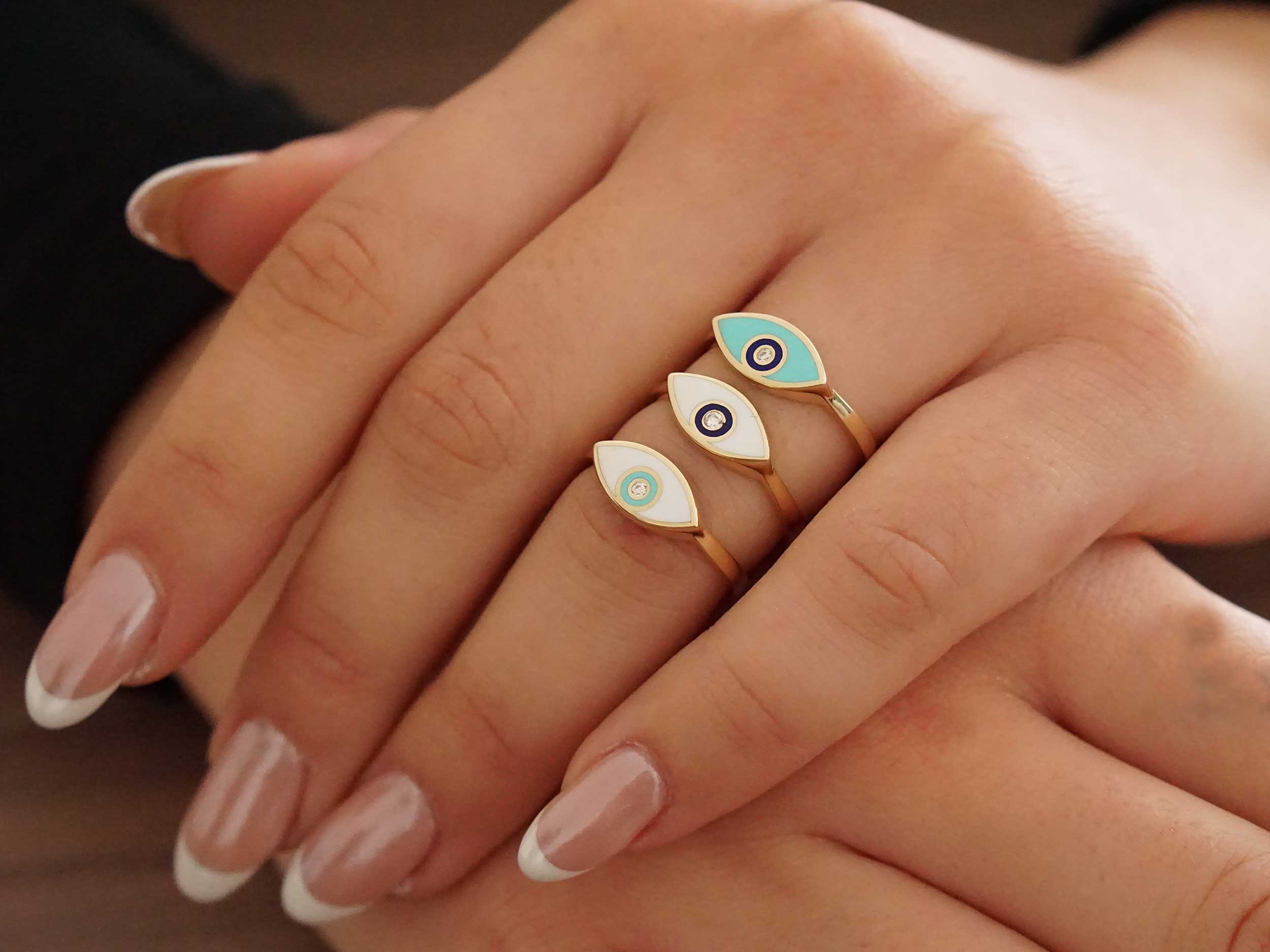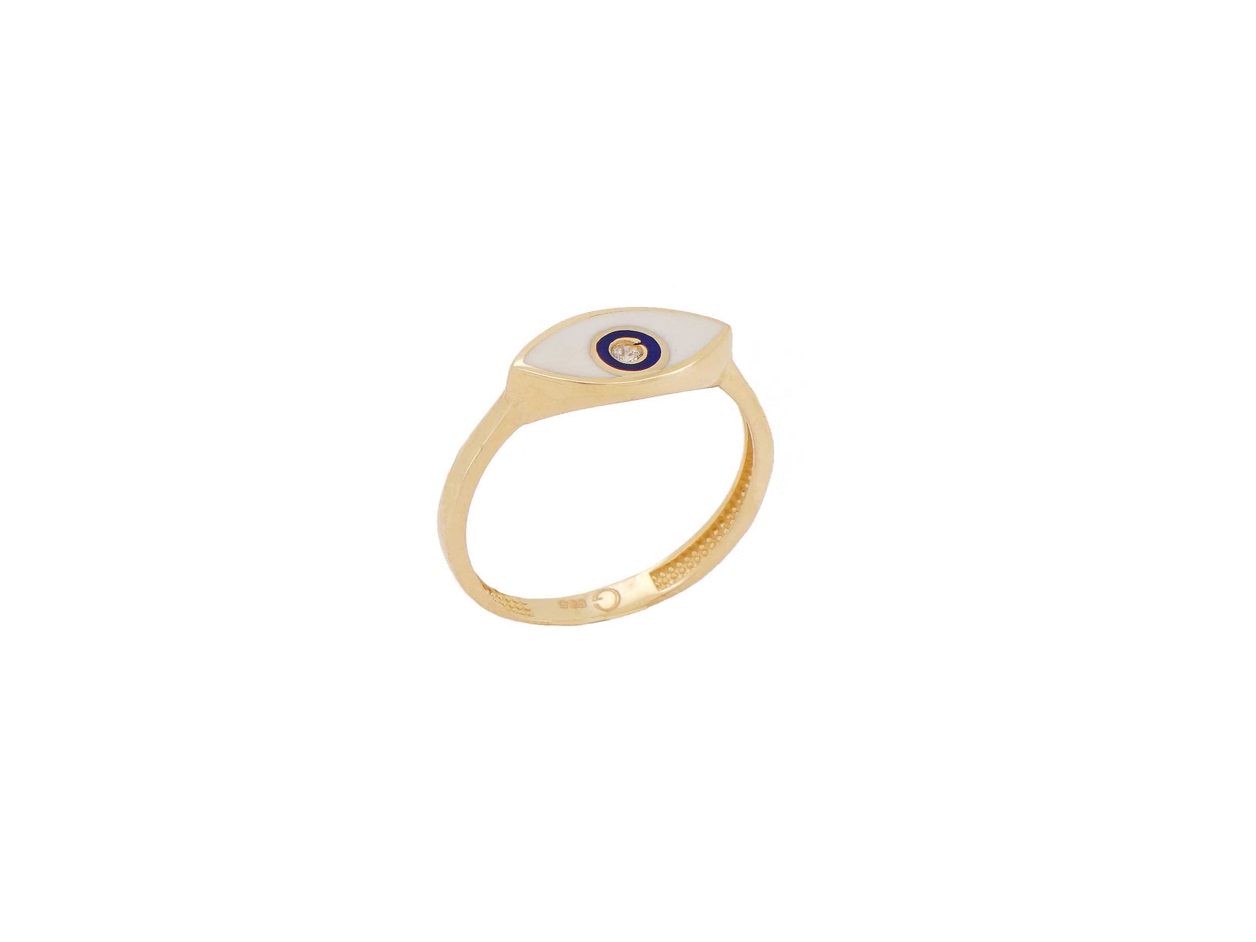 Δαχτυλίδι ματάκι χρυσό 14 Καρατίων, με λουστρέ φινίρισμα. Είναι διακοσμημένο με μια λαμπερή cubic ζιργκόν πέτρα και με σμάλτο λευκό και μπλε. Ένα υπέροχο χρυσό δαχτυλίδι για να συνδυάζετε με τα καθημερινά σας outfit!