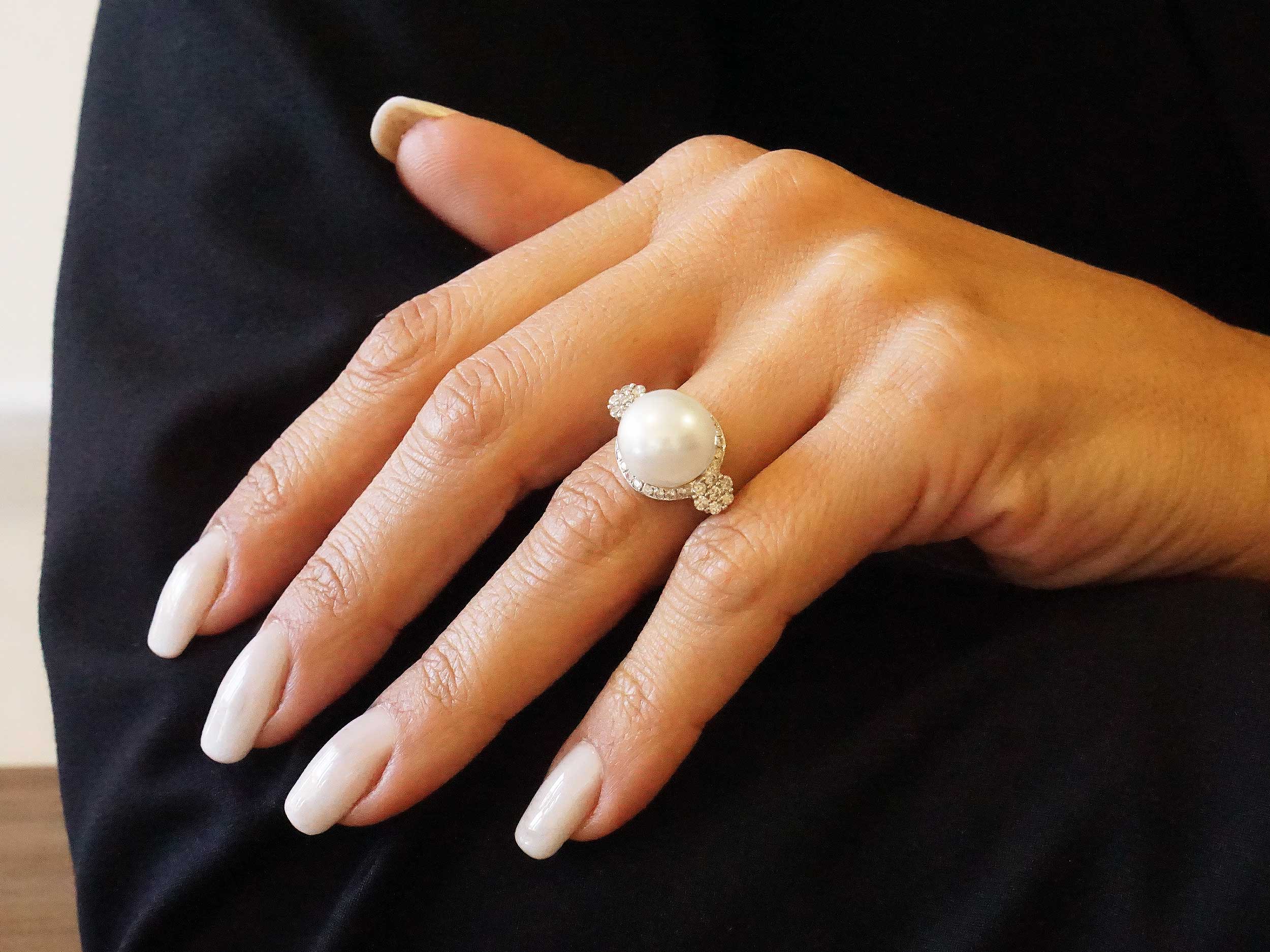 Μοναδικό δαχτυλίδι με μαργαριτάρι και διαμάντια σε λευκόχρυσο 18Κ, με λουστρέ φινίρισμα. Κοσμείται στο κέντρο με ένα υπέροχο λευκό μαργαριτάρι, περιβαλλόμενο από 20 διαμάντια κοπής rount brilliant, ενώ δεξιά και αριστερά υπάρχουν δύο κομψές ροζέτες από 14 μπριγιάν συνολικά που θα σας χαρίσουν μοναδική λάμψη!