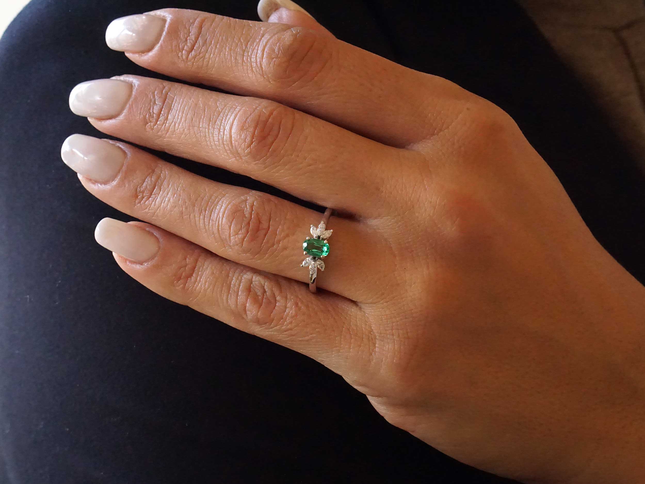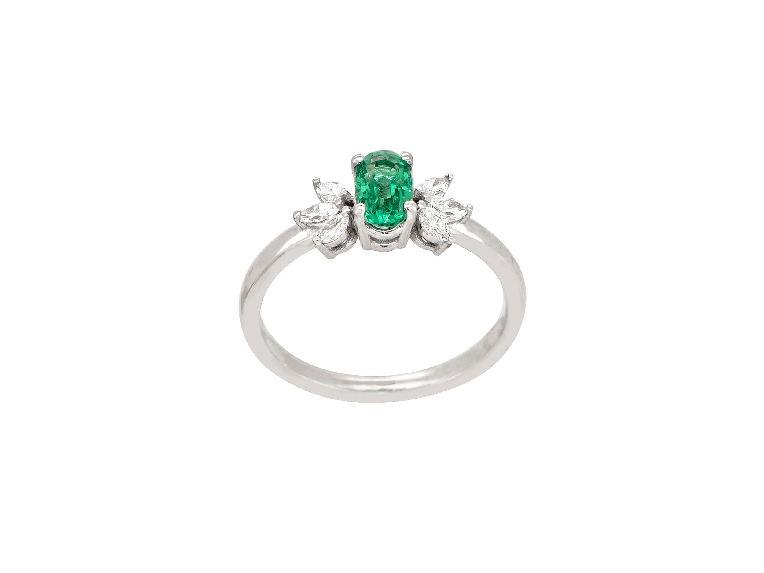 Εντυπωσιακό δαχτυλίδι με σμαράγδι και διαμάντια, σε χρυσό 18 Καρατίων. Κοσμείται με μια κεντρική πέτρα σμαραγδί σε σχήμα oval cut, ενώ δεξιά και αριστερά βρίσκονται 6 λευκά διαμάντια marquise cut. Ένα πολυτελές δαχτυλίδι ιδανική επιλογή για ιδιαίτερες περιστάσεις.