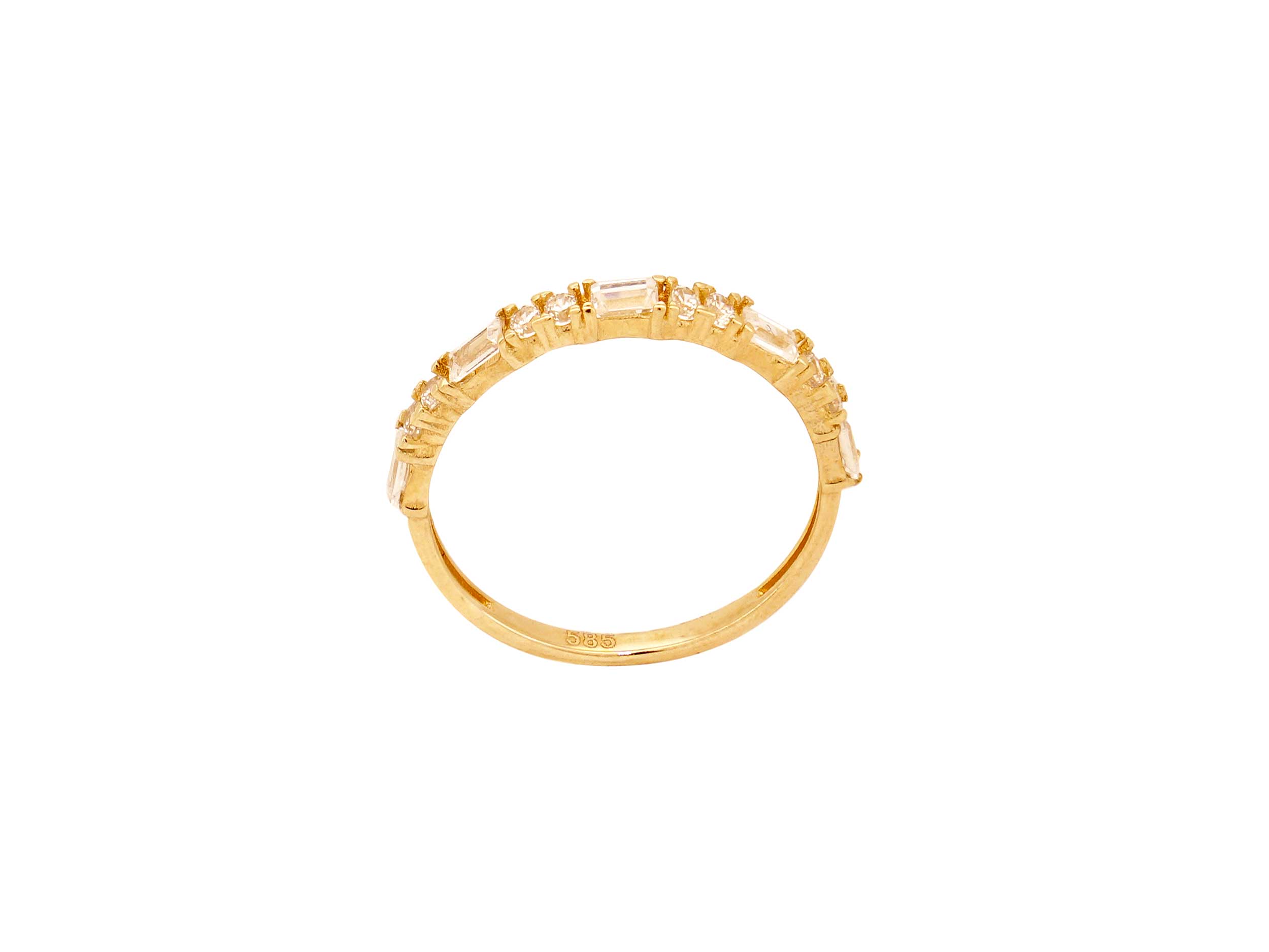 Δαχτυλίδι μισόβερο χρυσό 14 Καρατίων. Ένα κομψό δαχτυλίδι, με minimal σχεδίαση και υπέροχη λάμψη, διακοσμημένο με μια σειρά από λευκές cubic ζιργκόν πέτρες. Συνδυάστε το με περισσότερα δαχτυλίδια για να απογειώσετε ένα stylish outfit.