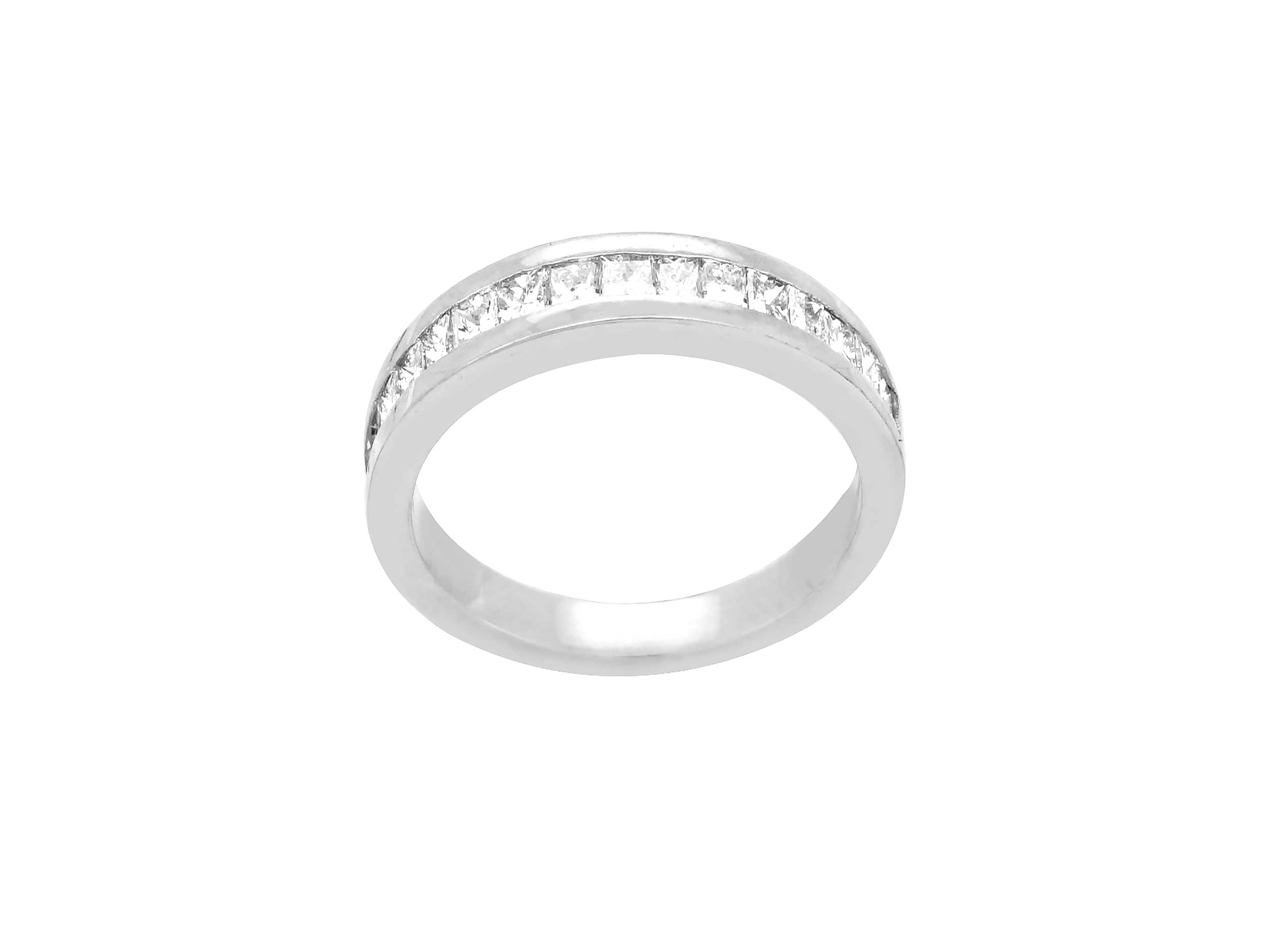 Δαχτυλίδι μισόβερο λευκόχρυσο 18 Καρατίων. Έχει λουστρέ φινίρισμα και είναι διακοσμημένο με 16 διαμάντια princess cut, που δημιουργούν μια εντυπωσιακή και λαμπερή σειρά.