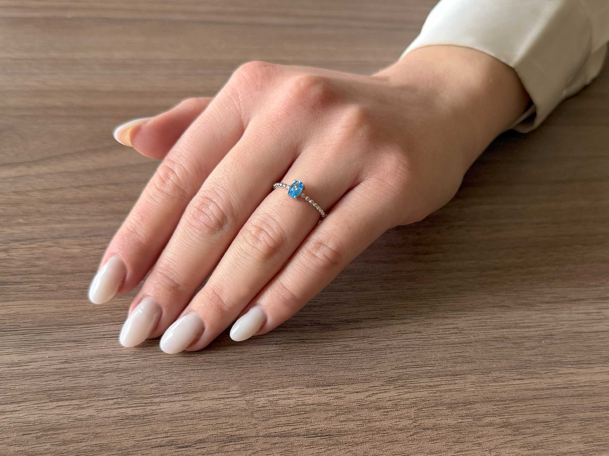 Δαχτυλίδι με οβάλ πέτρα και ανάγλυφη λουστρέ γάμπα, σε λευκόχρυσο 14 Καρατίων. Ένα κομψό μονόπετρο δαχτυλίδι, διακοσμημένο με μια υπέροχη cubic ζιργκόν πέτρα σε λαμπερό τιρκουάζ χρώμα!